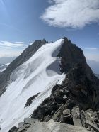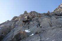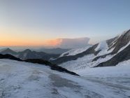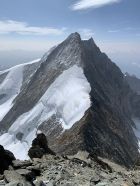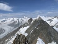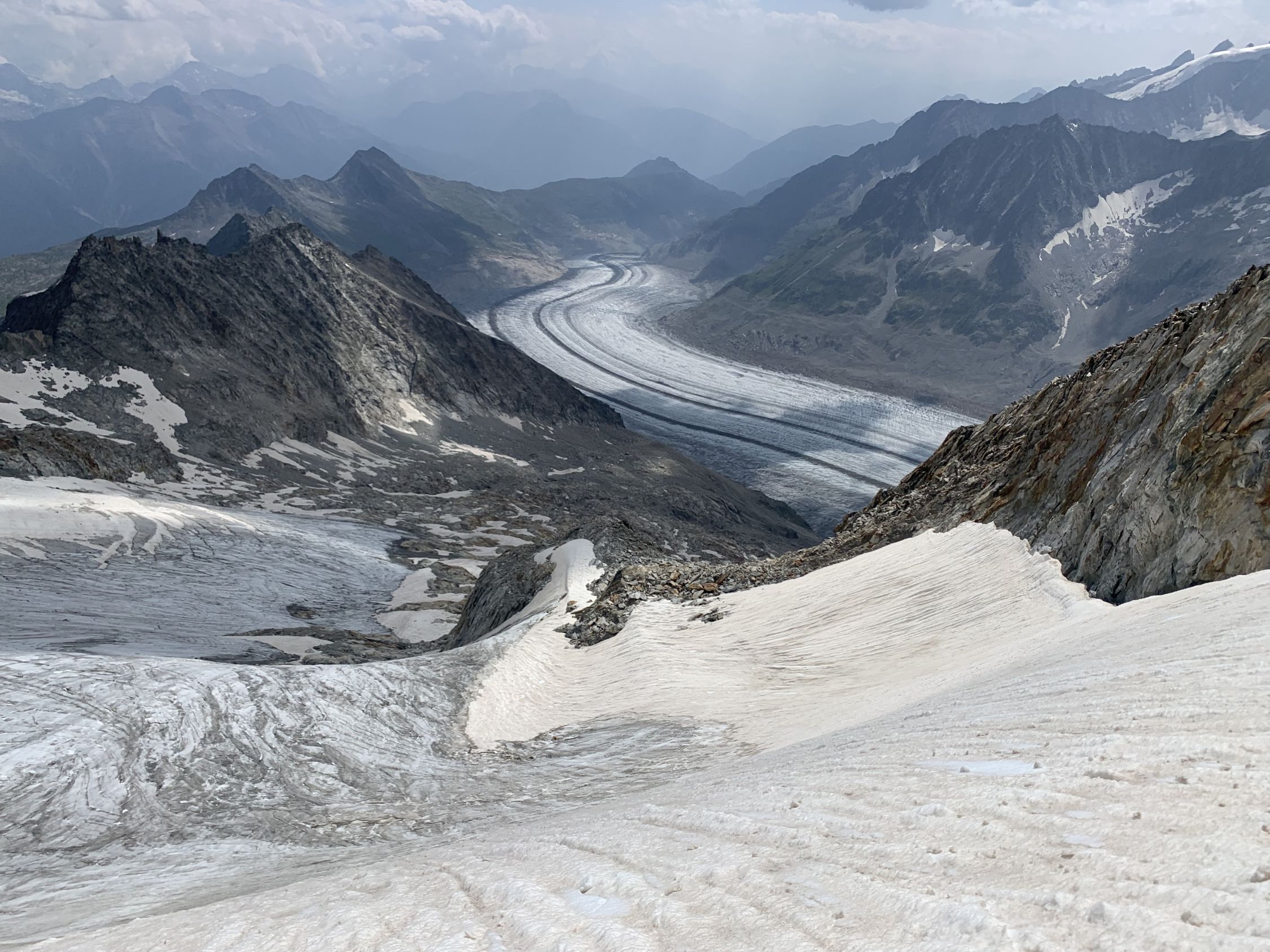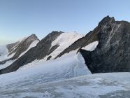 Grüneggfirn bis fast zur Lücke aper. Im weiteren Verlauf alle Gletscher gut verfirnt, lediglich im Aufstieg zum Wyssnollen teilweise flächig nur noch dünne, harte Auflage. Grat praktisch überall trocken, der wenige Gewitterschnee an schattigen Stellen störte nicht. Aktuell kann der östliche Arm des Wannenhorngletschers (ab Wannenhornsattel) nah an den westlichen Begrenzungsfelsen im weichen Firn kraftschonend abgestiegen/abgerutscht werden. Es finden sich auch durch die Moränen-/Geröllbänder im unteren Teil noch Schneerinnen, auf denen bequem abgerutscht werden kann. Der Übergang zum Grossen Aletschgletscher ist nicht trivial - in den Bildern ist der geeignete Punkt (mit improvisierter Abseilstelle) markiert.