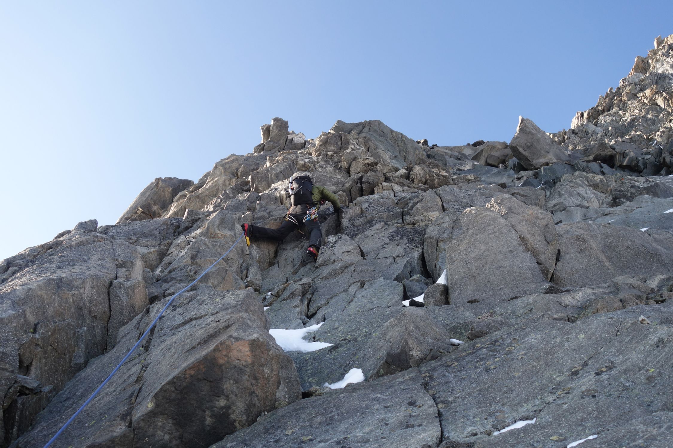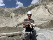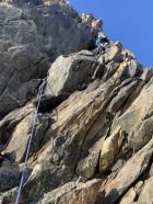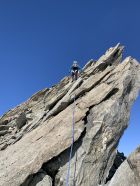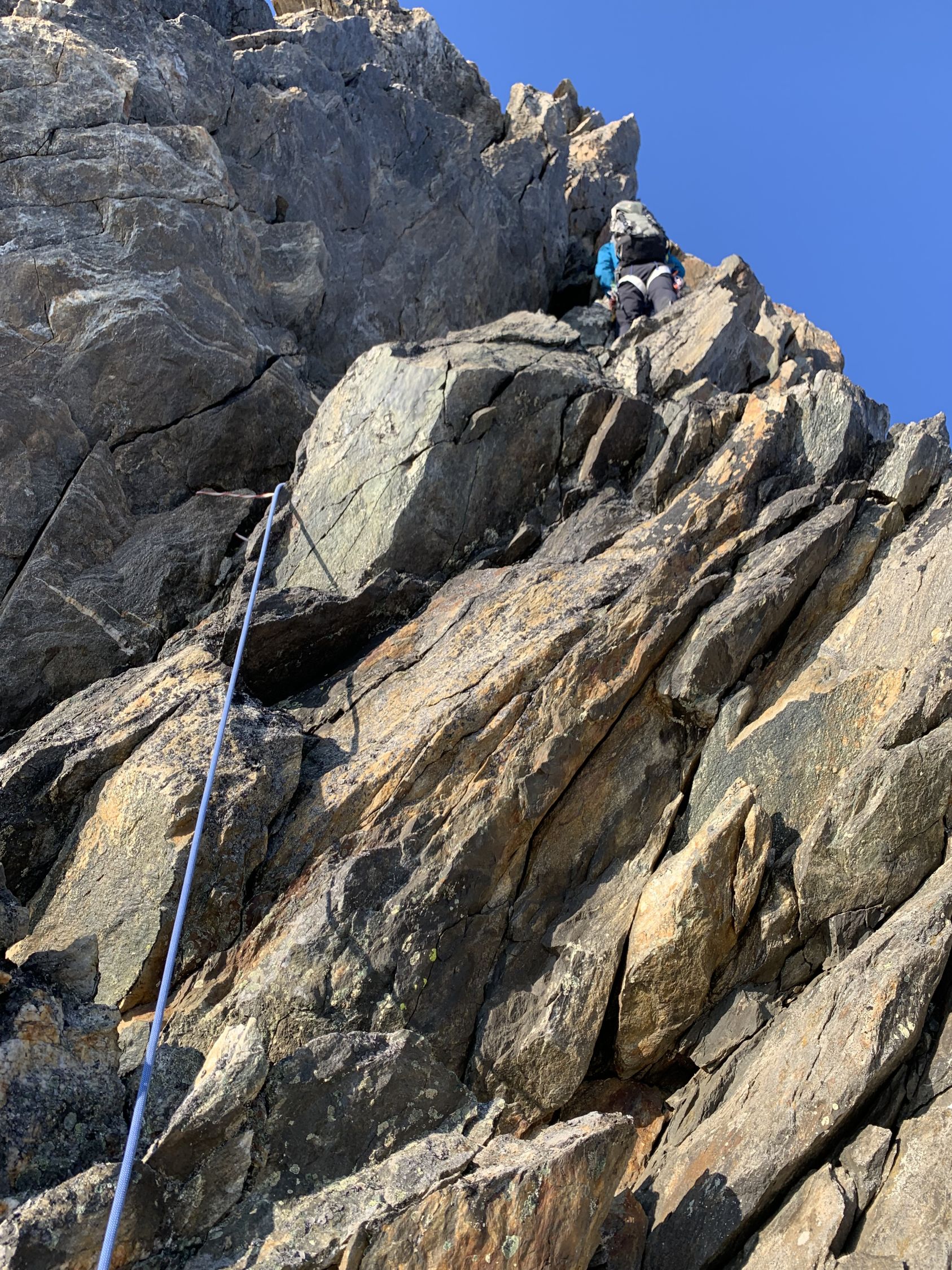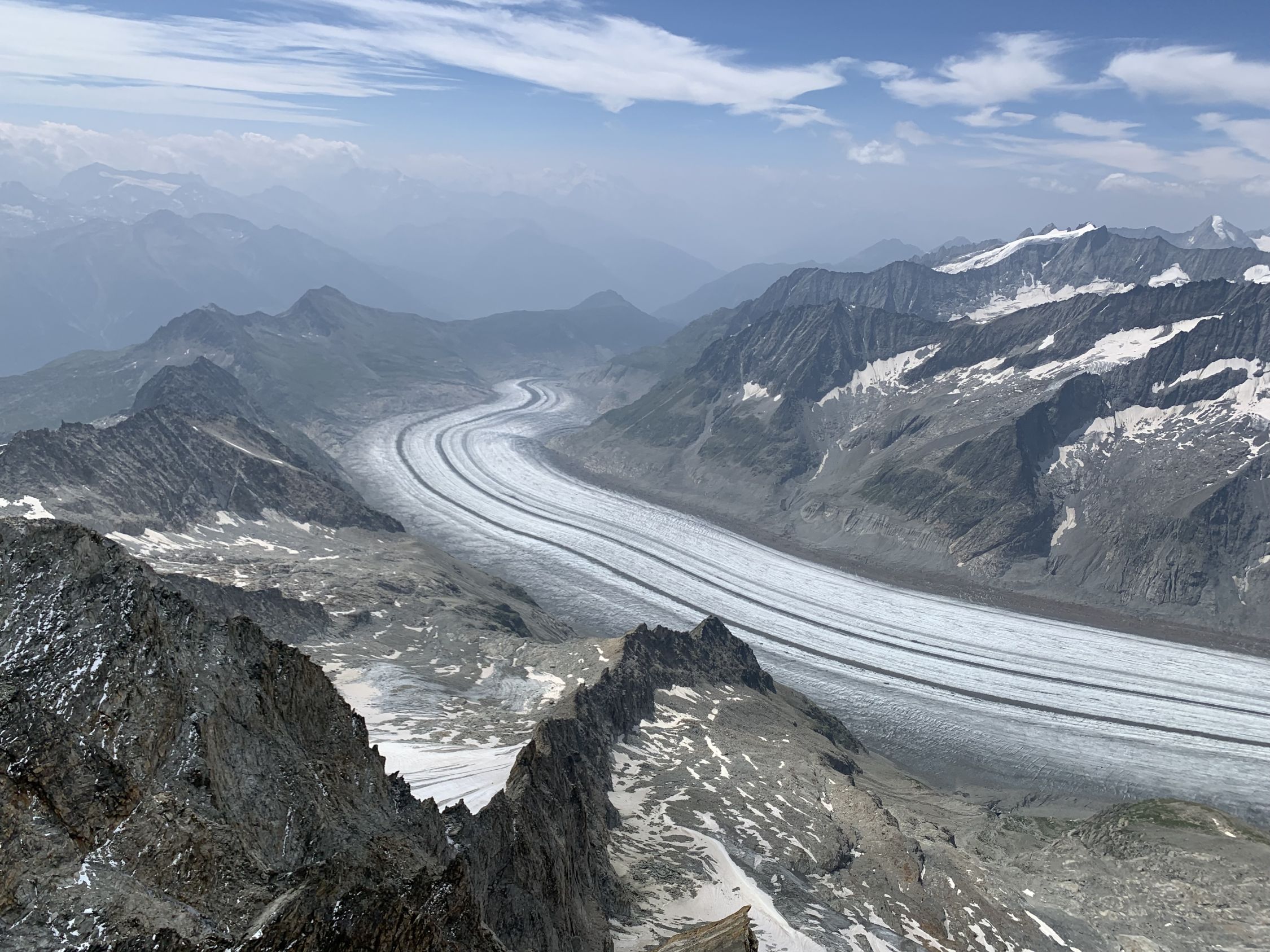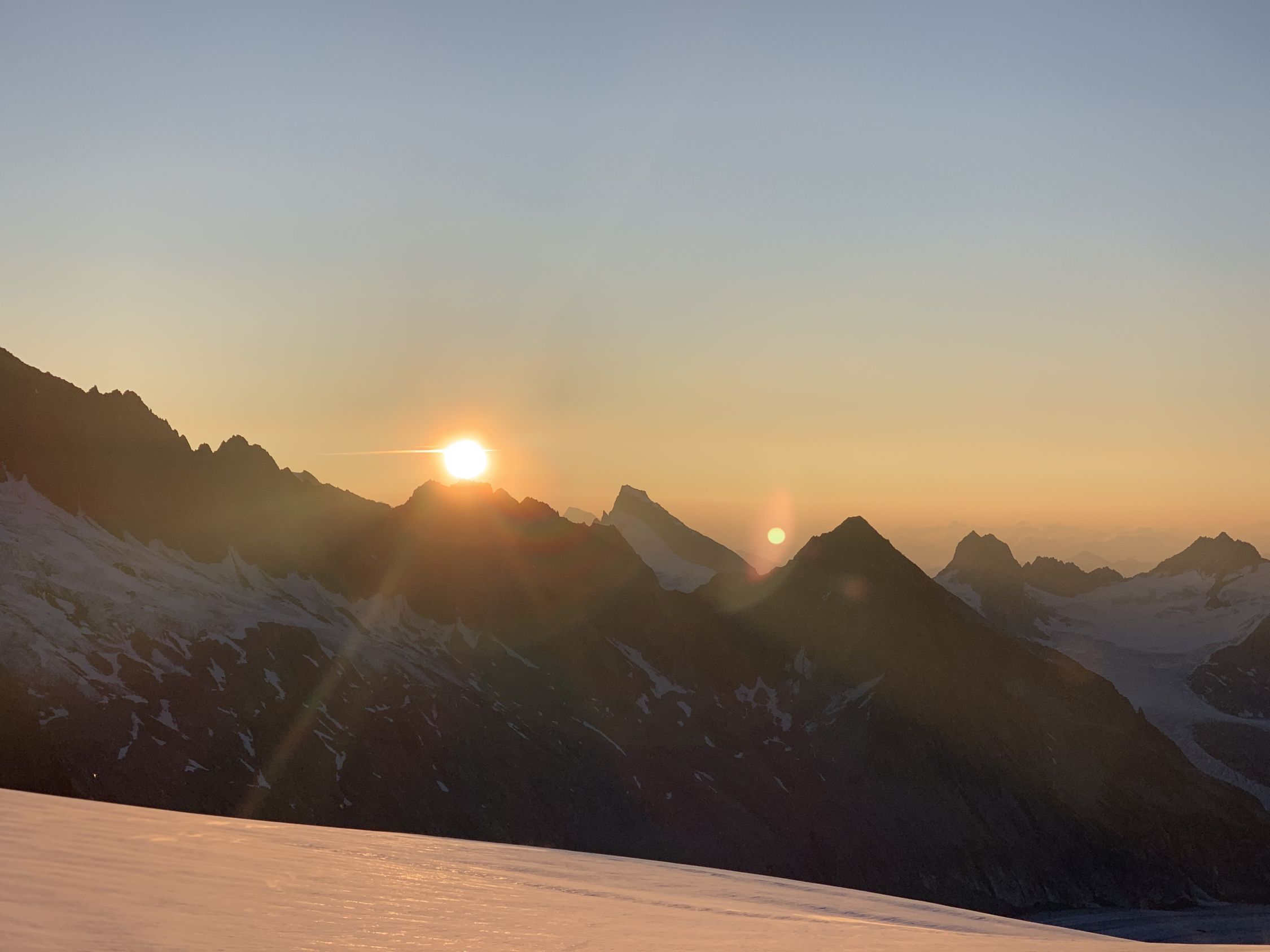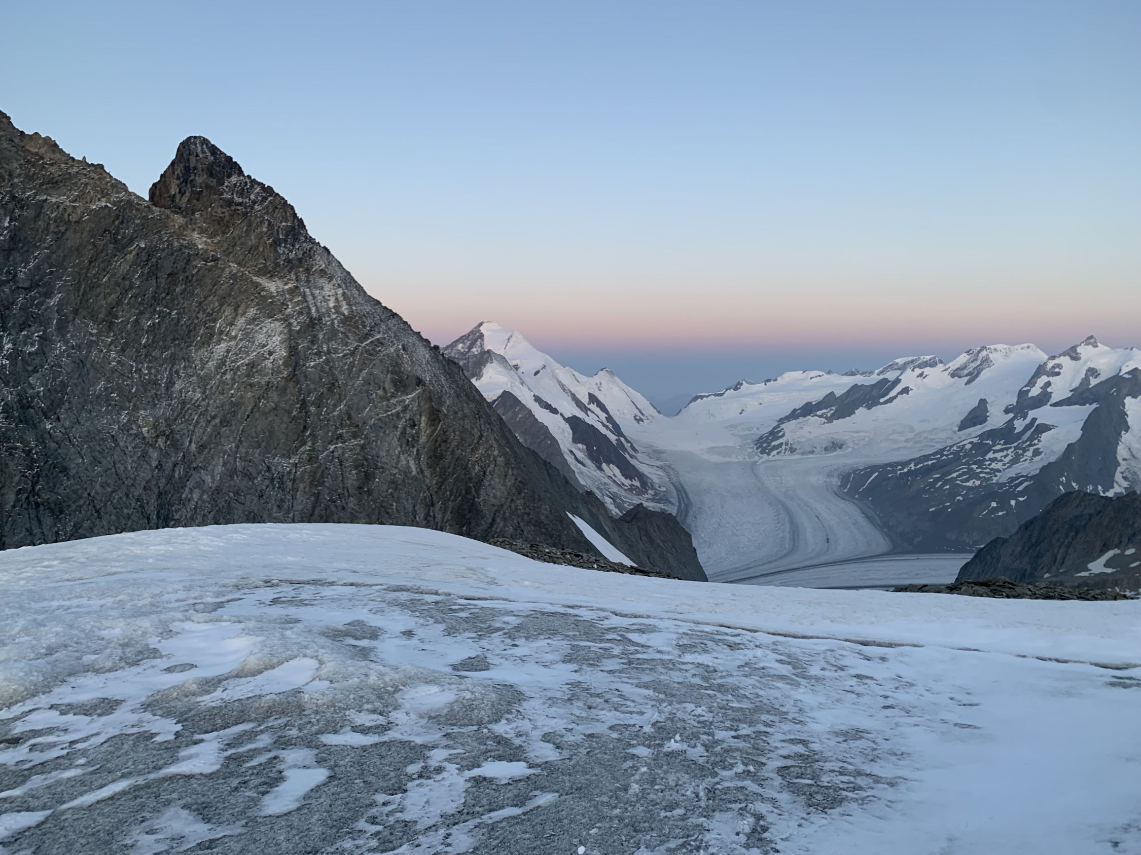 Grossartiges Bergabenteuer mit Silvan. Merci hierfür! Eine exklusive Route, die kaum Begehungen kennt. In den letzten 20 Jahren ist wohl nur jene von JFK (Routenbeschrieb hikr.org) bekannt. Wir benötigten für die Tour 17 h, davon neun Stunden allein auf dem Gratverlauf. Die Aufstiege zum Fiescher-Gabelhorn (NE-Grat) und zum Gross-Wannenhorn sind im guten Fels, der restliche Gratverlauf ist meist brüchig bis sehr brüchig. Alles aber insgesamt schön zu klettern. Im Abstieg gen Wannenhornsattel haben wir aus Versehen in die falsche Flanke (Ost) abgeseilt. Dies kostete erheblich Zeit (u.a. weil wir auch die bestehende Abseilsstelle verstärkten), ermöglichte uns aber auch, den dritten Gendarmen zu übersteigen (sie Routenbeschrieb). Der Übergang von den Moränen des Wannenhorngletschers auf den Grossen Aletschgletscher ist herausfordernd, wir fanden zufällig eine improvisierte Abseilsstelle (Bild)