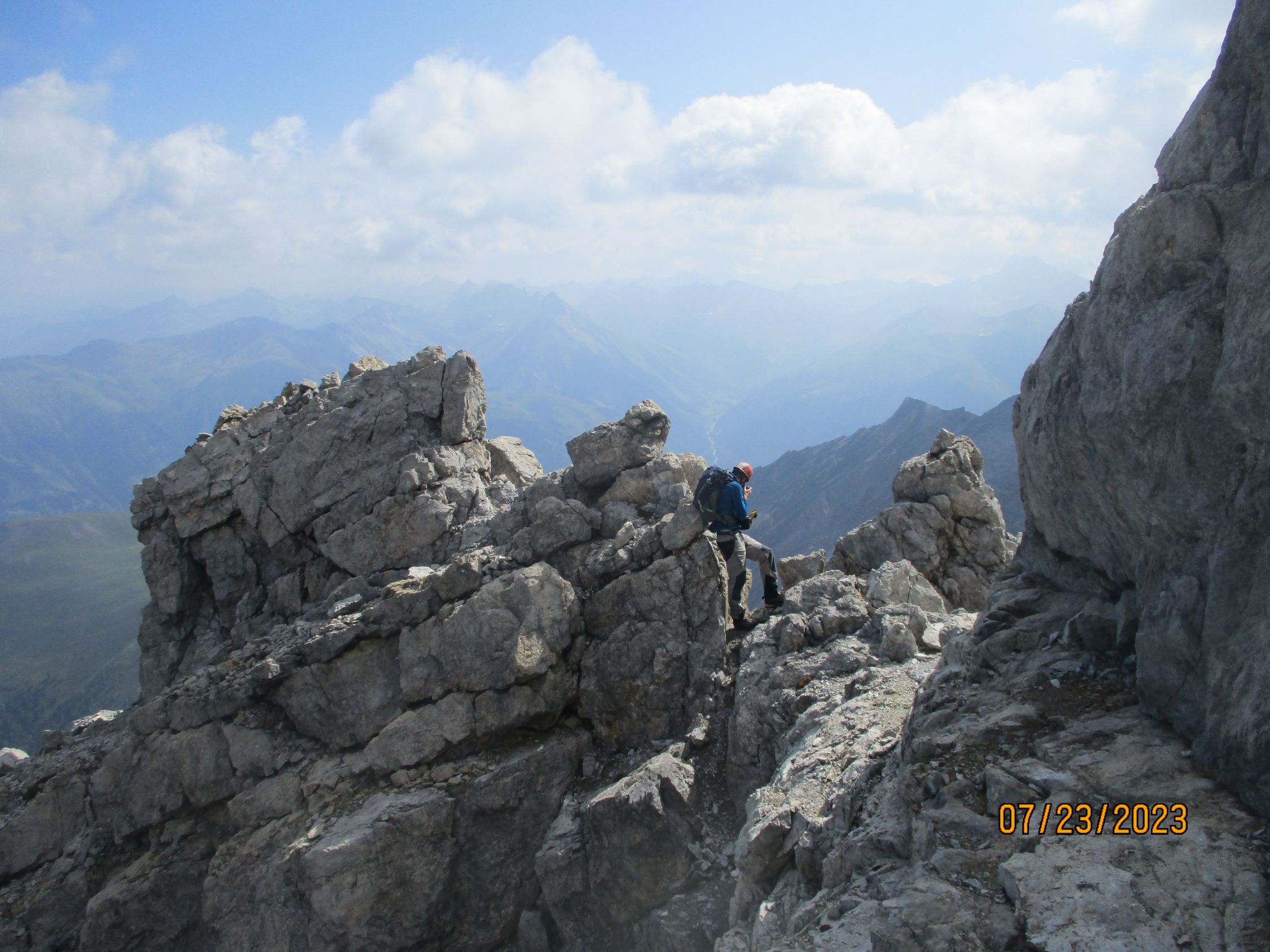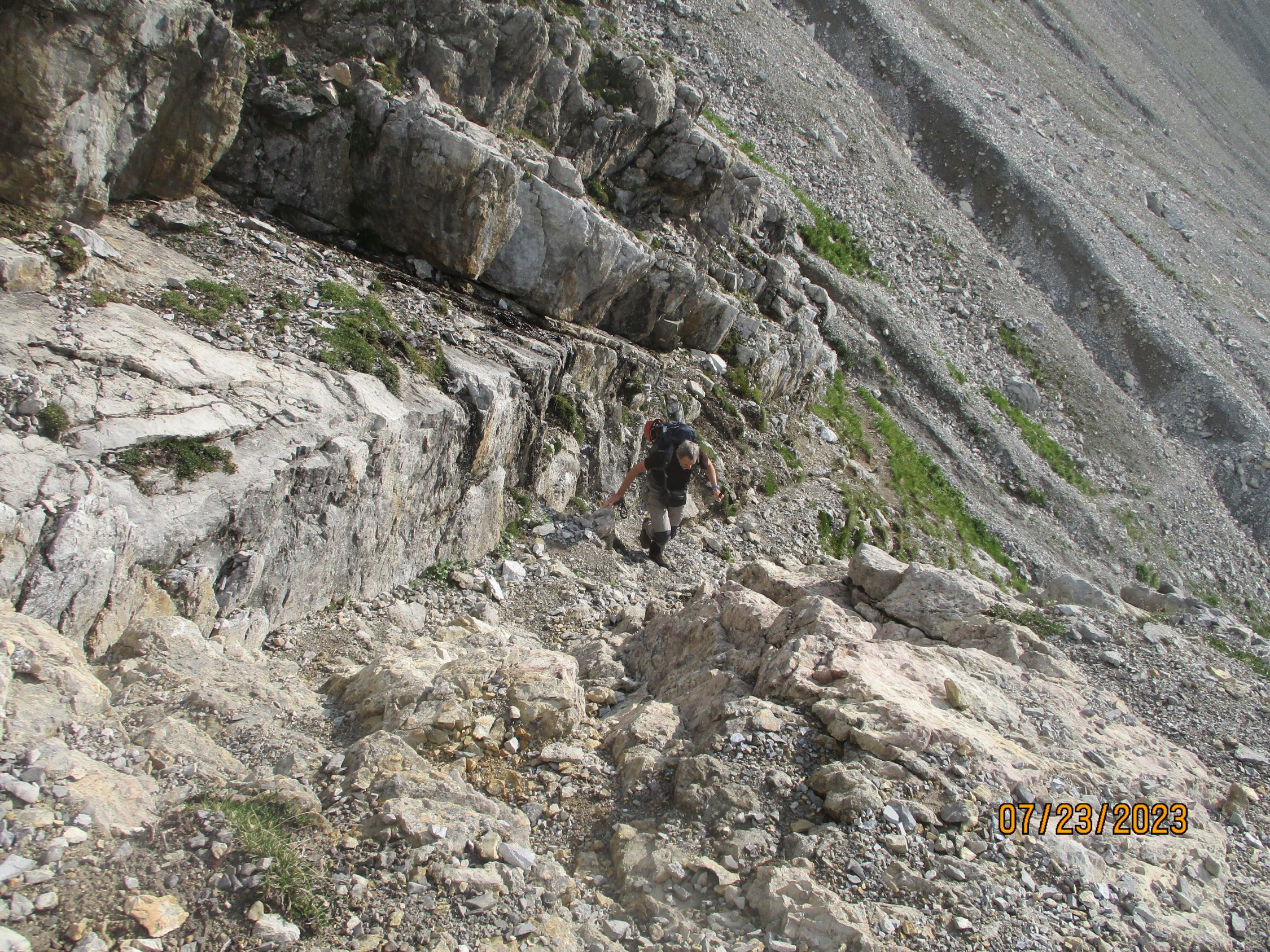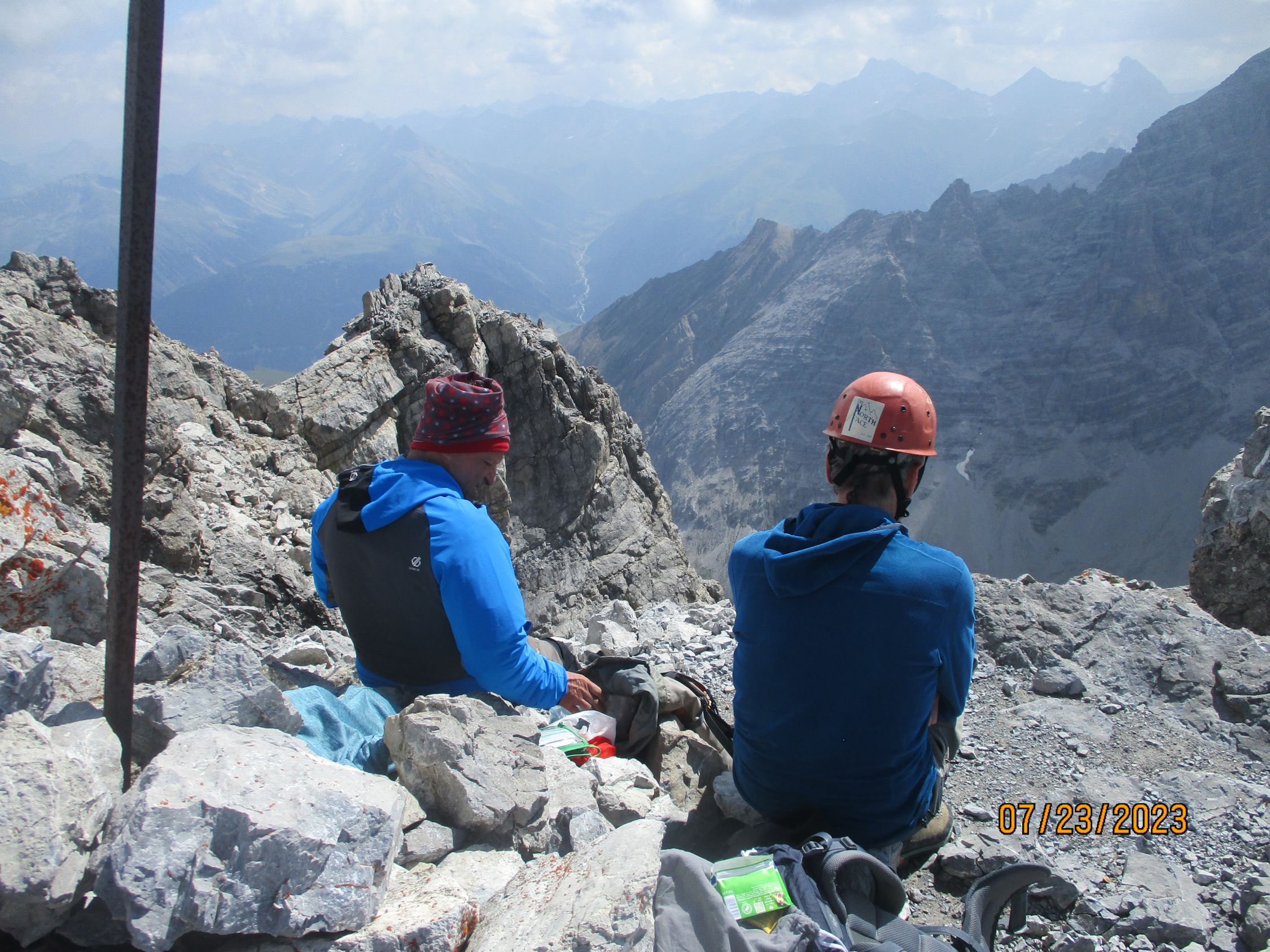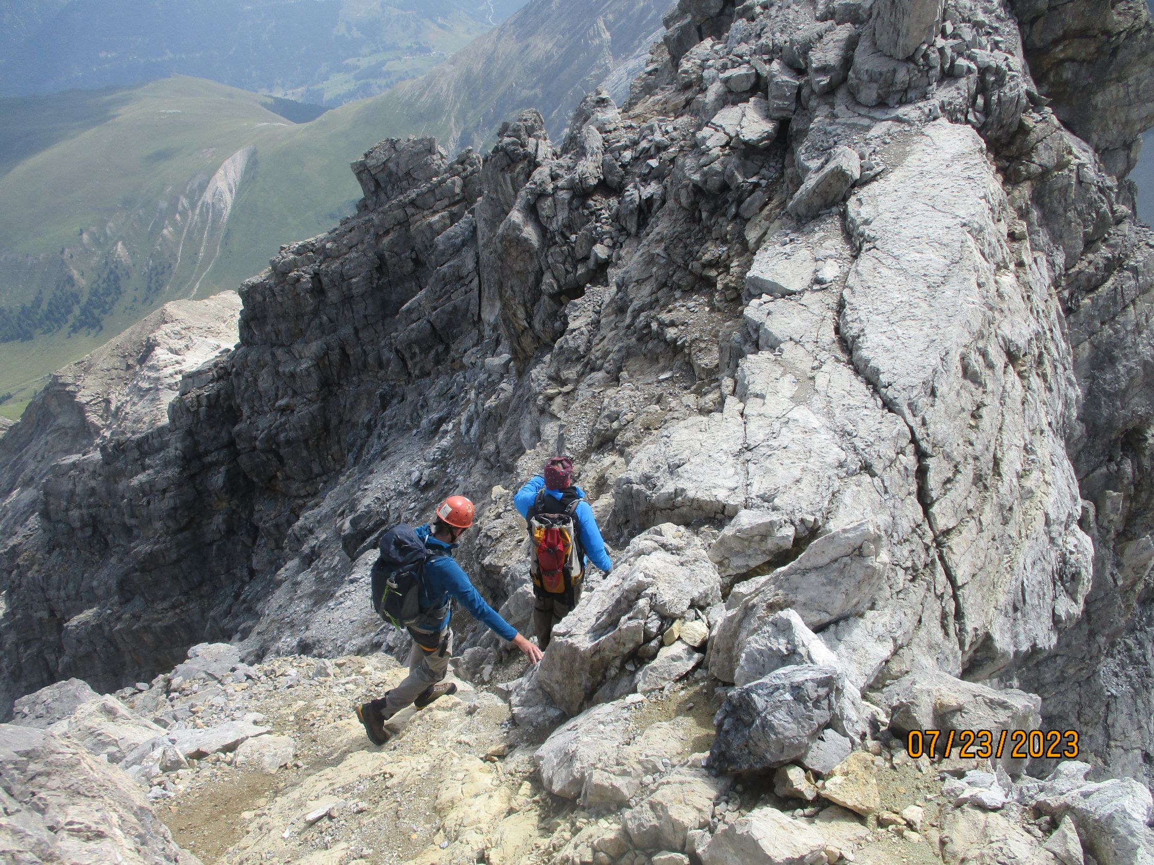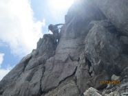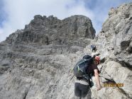 Wir waren allein in der Route. Das war gut so, denn diese Tour verträgt aufgrund der Steinschlaggefahr nicht viele Seilschaften gleichzeitig. Auf dem Gipfel traf noch eine Zweierseilschaft ein, welche über den Westgrat aufgestiegen war, und über diesen auch wieder zurückzukehren beabsichtigte.