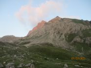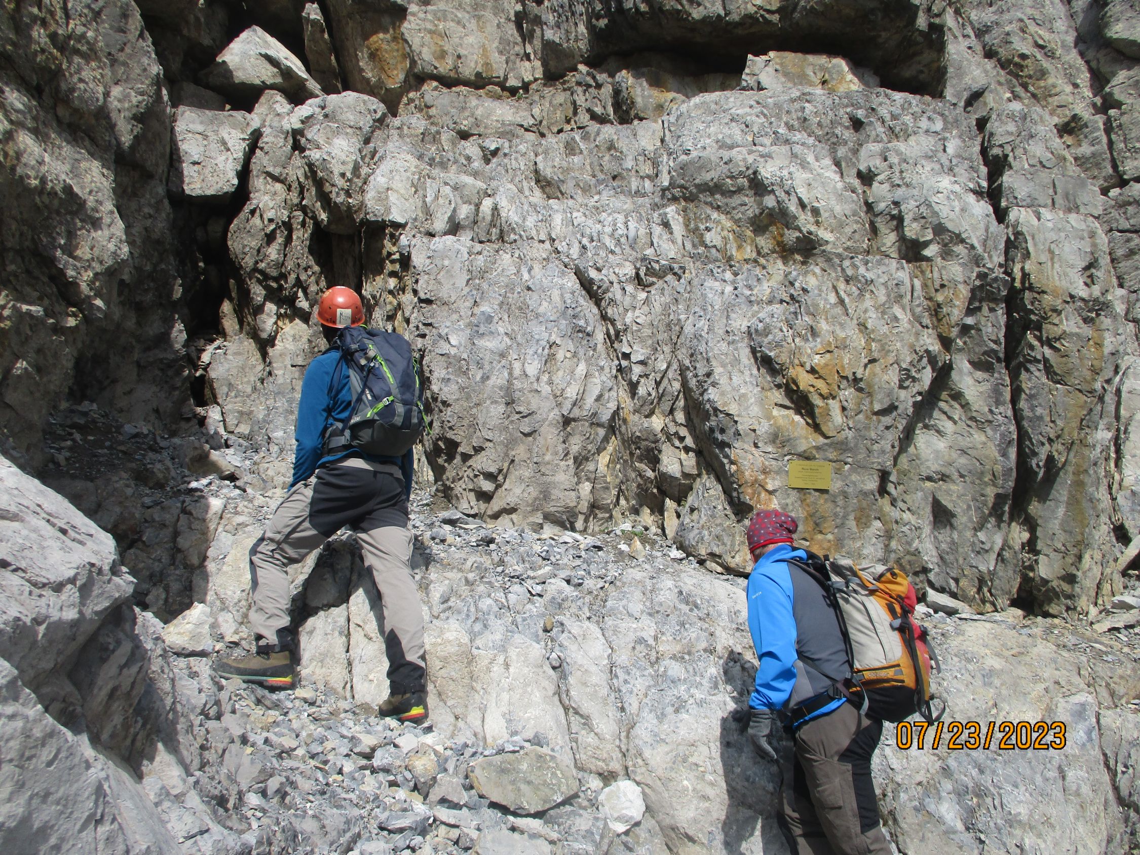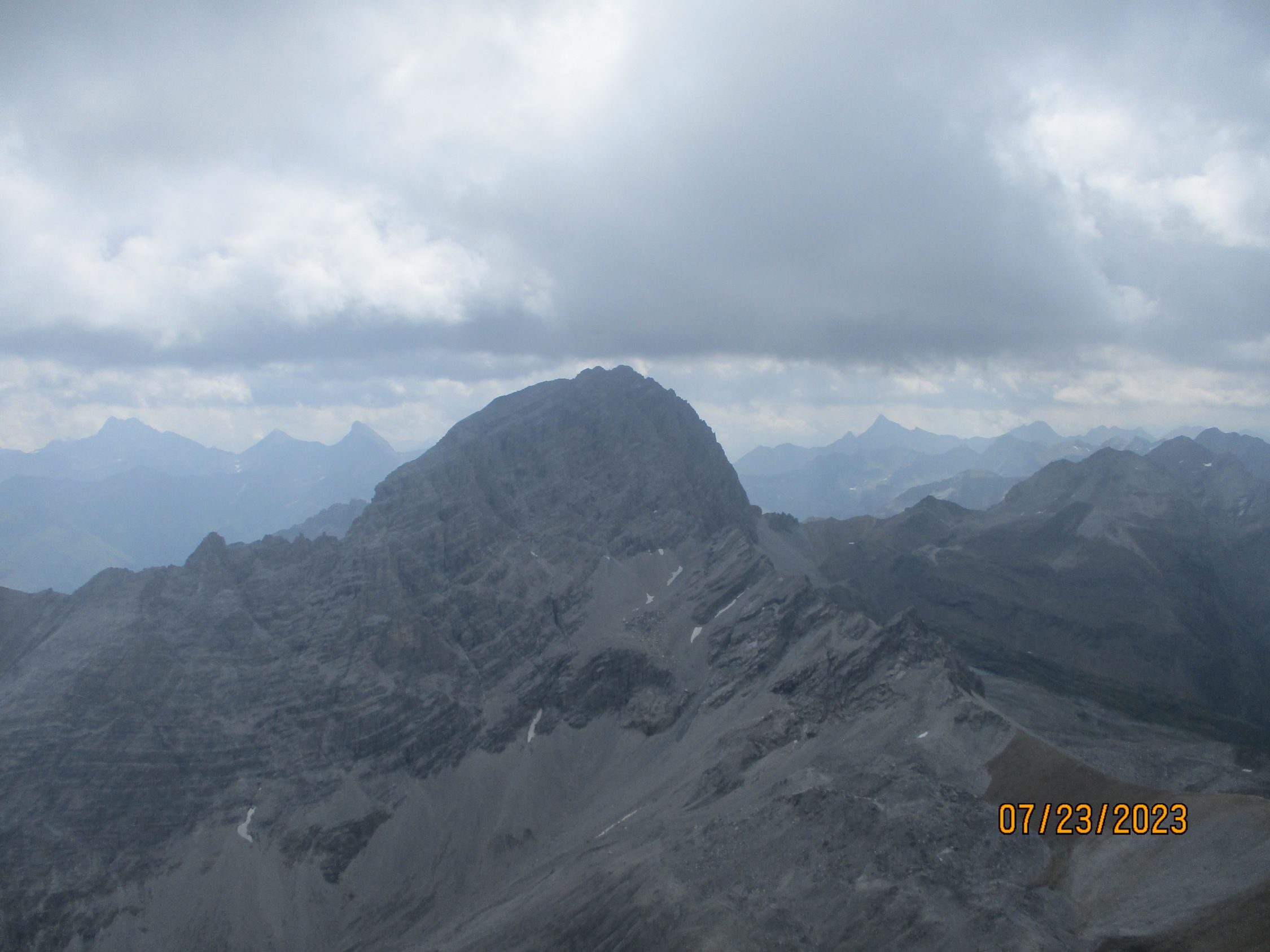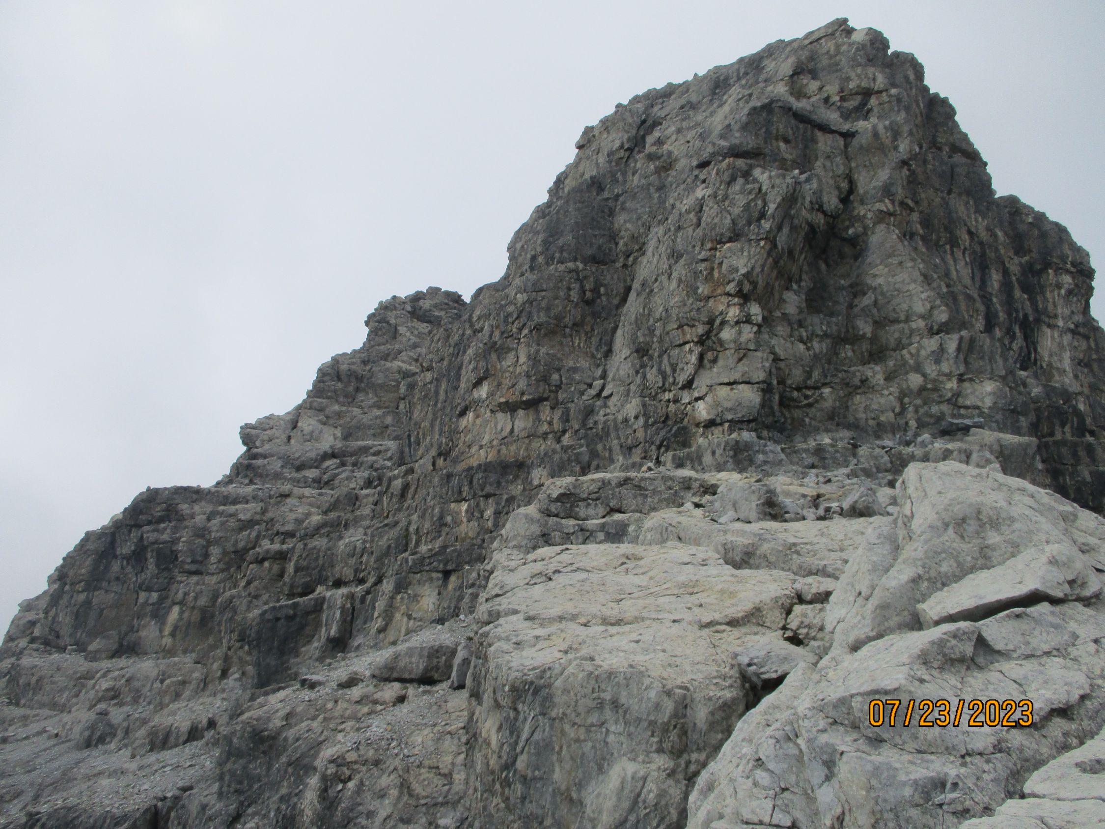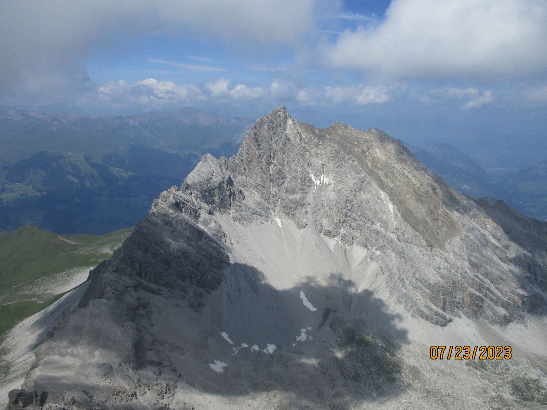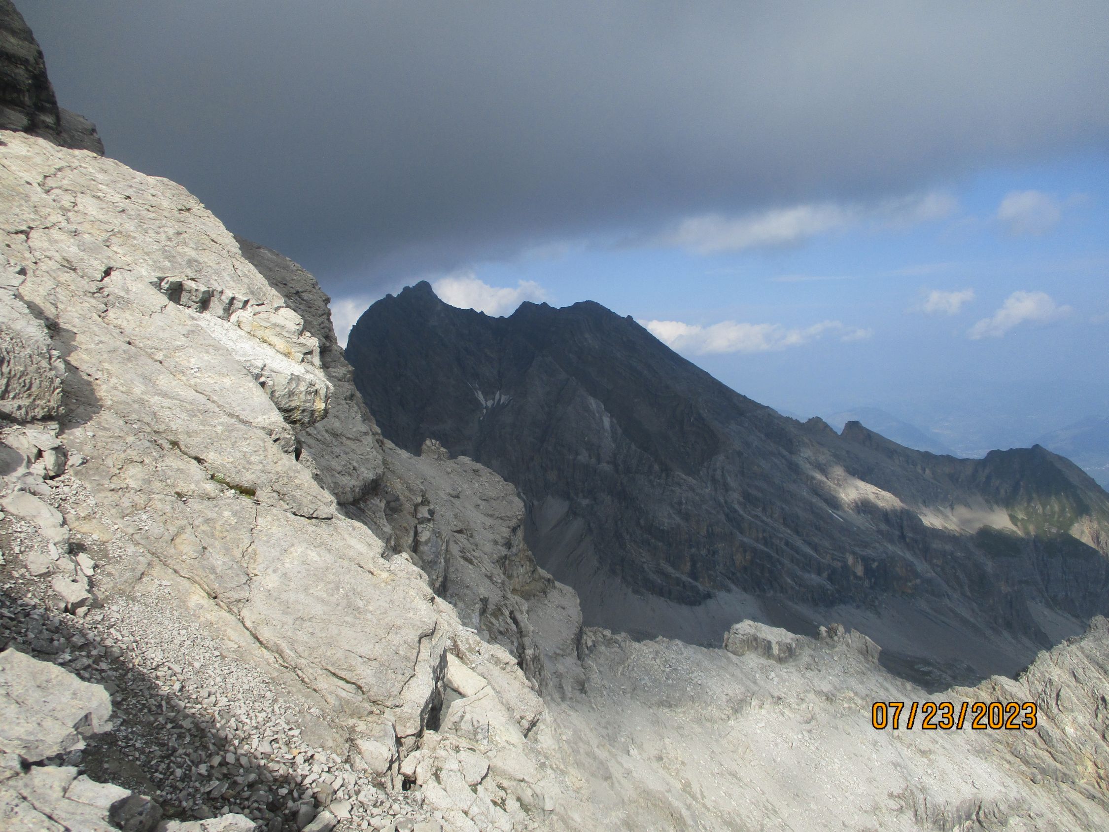 Wir waren allein in der Route. Das war gut so, denn diese Tour verträgt aufgrund der Steinschlaggefahr nicht viele Seilschaften gleichzeitig. Auf dem Gipfel traf noch eine Zweierseilschaft ein, welche über den Westgrat aufgestiegen war, und über diesen auch wieder zurückzukehren beabsichtigte.