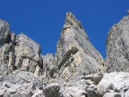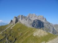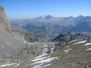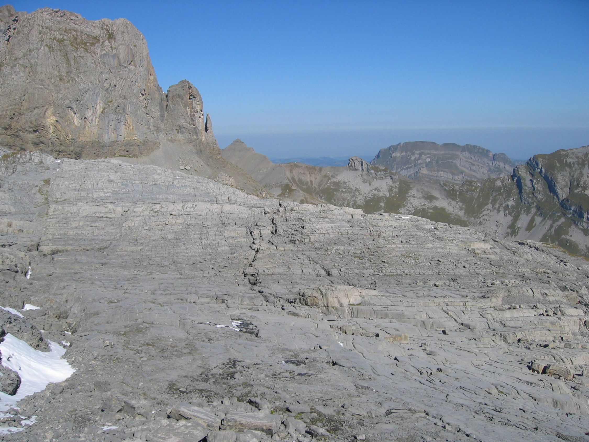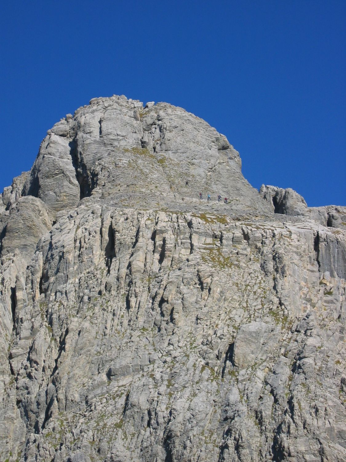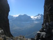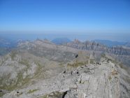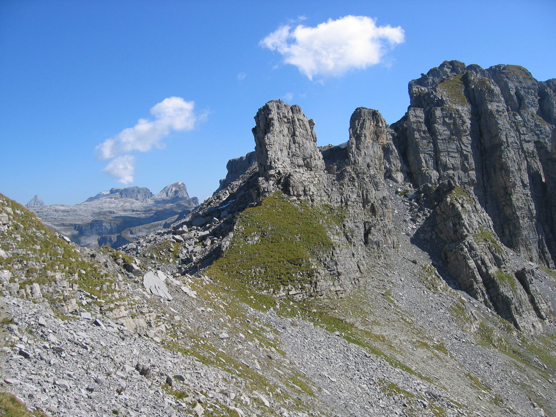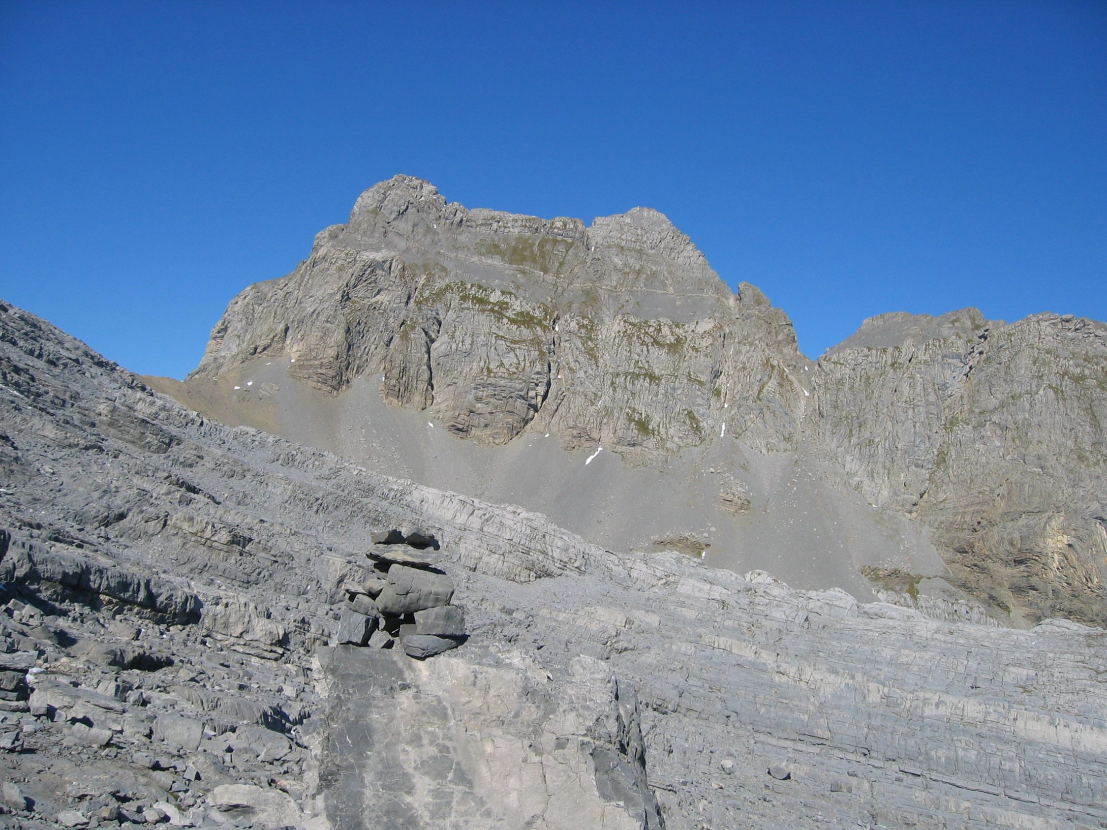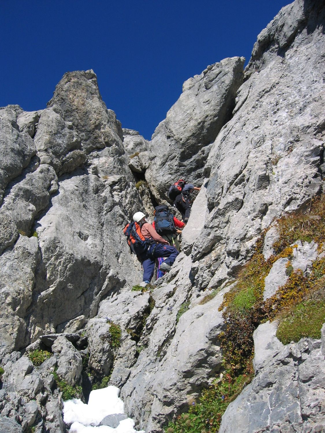Links abgebogen und steil unter die Felsen bei Ober Sädel zum zweiten Couloir das auf die Läged Windgällen führt. Ueber die grauen Platten den Steinmandli folgend zum Einstieg auf die Schächentaler Windgällen. In griffigem Fels zur Spalte hinauf wo ein mit Ketten gesicherter "Schlifer" (Quergang) zum Gipfelfelsen führt.