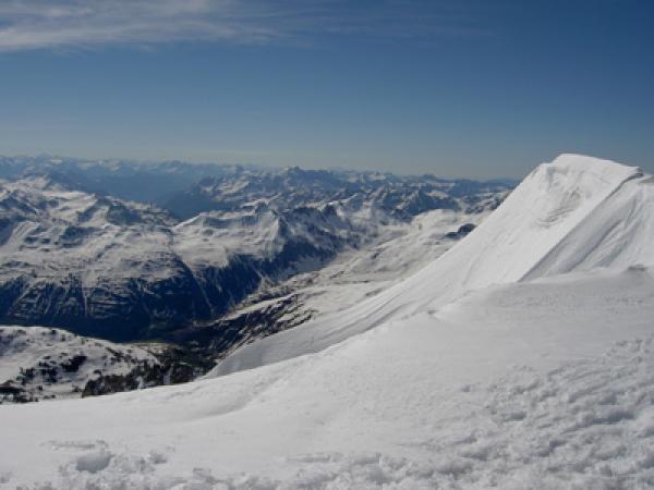 Beste Verhältnisse! Der Schnee war gut durchgefroren. Der Gletscher ist bis Belvedere schneebedeckt. Gipfelgrat mit Steigeisen oder mit Ski/Harscheisen begehbar. Abfahrt um 11 Uhr optimal!