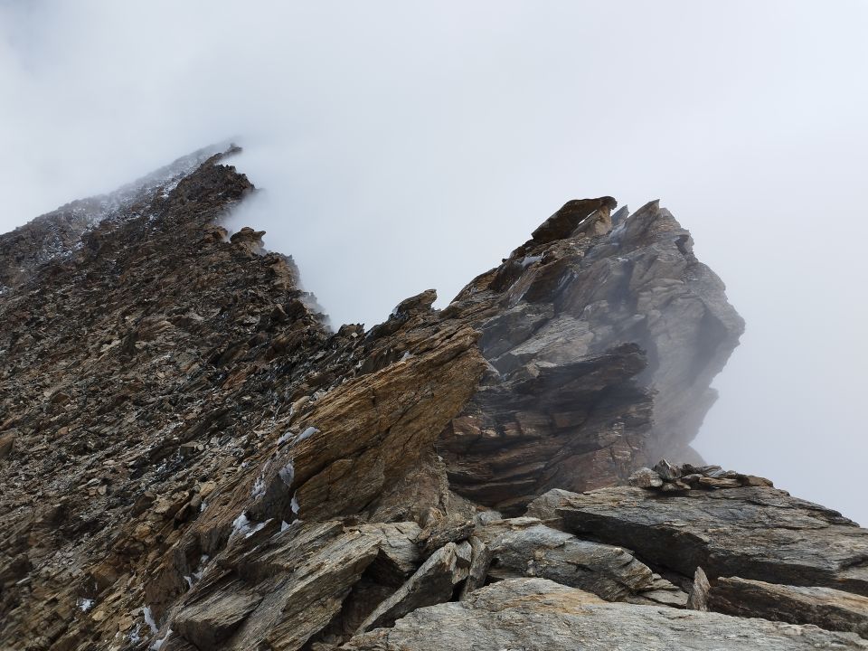 Dieser Bericht ist für die zwei sympathischen jungen Bernerinnen die aufgrund des starken Windes am Lagginjoch umgedreht sind und am Einstieg zum Hohlaubgletscher noch ein paar nette Worte mit uns gewechselt haben. Dadurch waren wir sogar noch später als geplant am Einstieg, was jedoch ein entscheidender Vorteil war wie sich kurz darauf herausstellen sollte. Ca. um 11:15 Uhr begannen wir mit der Kletterei vom Joch mit viel Wind und bereits im unteren einfachen Teil mit stellenweise Wassereis, aber auch mit der Hoffnung dass die Wolkendecke bald aufreisst und die Sonne den Grat und uns erwärmt. Und so war es denn auch, die Strategie aufgrund der Wetterprognosen mit der ersten Bahn hochzufahren, noch einen Kaffee in Hohsaas zu trinken und erst spät einzusteigen hat sich voll ausbezahlt. Die Kletterei am Grat war dennoch teils anspruchsvoll aufgrund der Verhältnisse, insbesondere auf der ganztags windigen Westseite. Aber alles sehr gut und problemlos machbar mit Steigeisen, wenn auch mit etwas mehr Zeitbedarf. Für die Bahn runter reichte es logischerweise nicht mehr, aber den langen Abstieg nahmen wir mit einem Lächeln in Kauf und erreichten ca. um 22 Uhr unseren Bus an der Talstation.