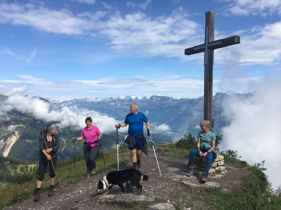 Eher selten, alleine auf dem Gipfel bei toller Aussicht. In den Tälern liegt Restbewölkung.