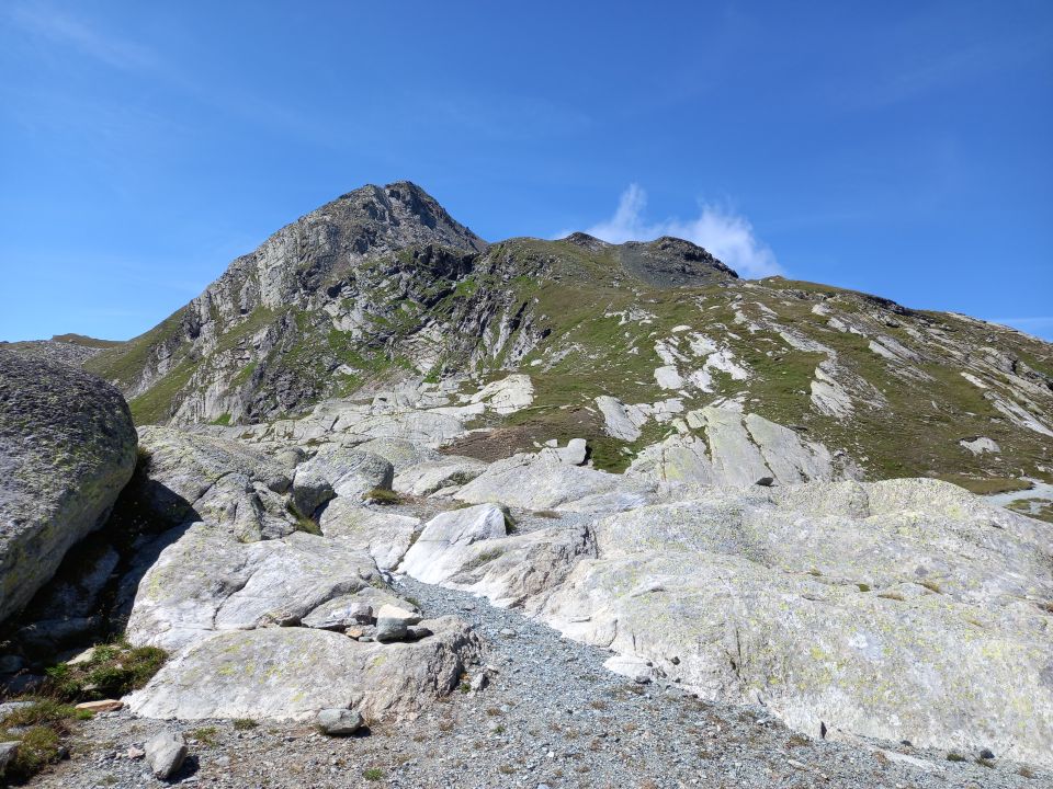 Von St.Moritz im hoffungslos überfüllten Bus 4 nach Maloja Posta, Hurtig hoch über Pila - Plan di Zoch - Lägh dal Lunghin, nach dem See der oberen nicht-offiziellen Wegspur folgen, Aufstieg durch die Nordflanke durch weichen Schotter auf recht gutem Zick-Zackweglein bis zum Grat, dann auf dem wbw Weg zum Gipfel, kurz unter dem Gipfel gibt es vor einer Felsplatte zwei Wegvarianten, die linke ist etwas exponierter, bei der rechten muss eine Felsplatte überwunden werden, was im Abstieg und bei Nässe wohl etwas heikel sein könnte. Schöne Aussicht auf die Oberengadiner Seenplatte. Abstieg auf dem wrw Weg zum Pass Lunghin und weiter zum Septimerpass und hinunter nach Bivio.