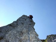 Die Schlüsselstelle, ein markanter Pfeiler (gem. Topo Variante durch steilen Riss, 5b) kann durch die Rinne (Fixseil) ostseitig oder auf der rechten Seite (ca. 4b) umgangen werden.