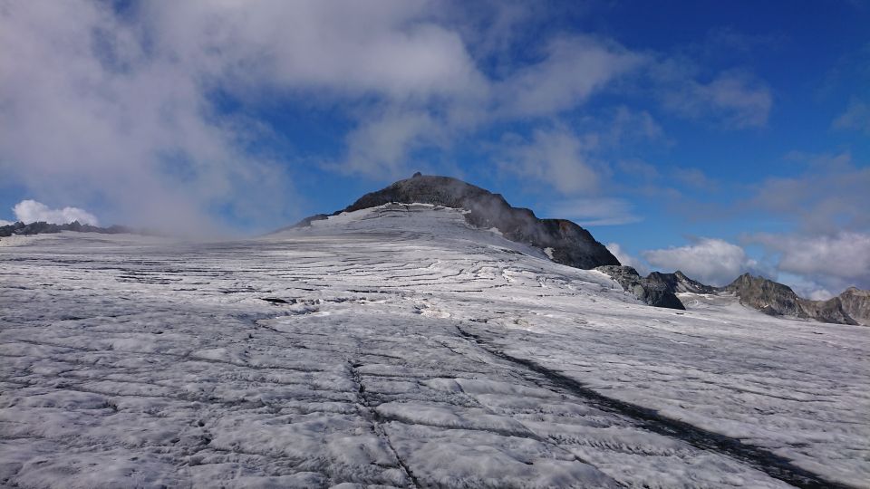 Gletscher fast komplett aper, Spalten gut sichtbar. Übergang auf den Grat an einigen Stellen gut machbar, wir haben einen guten Zustieg etwas westlich von P. 3064 gefunden. Orientierung am Grat einfach, bis auf eine Stelle, wo etwas unklar ist, ob man links oder rechts rum hoch soll - > hier direkt hoch :) Grat schneefrei.