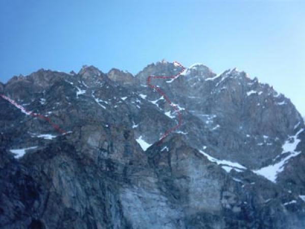 Von der Hütte momentan noch alles über Firn, zuletzt steilen Hang nach rechts querend, zum Einstieg in die Südwand. Bald ein großes Couloir queren zu dessen rechten Begrenzungsrippe, der man (kurze Stellen III+ oder IV) folgt bis zu einem senkrechten Pfeiler. Wir sind zwei kurze Seillängen den Pfeiler direkt hinauf (ca. IV+) zu einem Band, das nach rechts in ein Couloir führt. In steilem sehr weichem, Schnee (ein wenig unangenehm) zum Ausstieg auf den SE-Grat wenige Meter vor dem Gipfel (4065m).