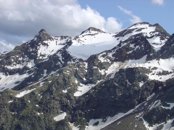 Anfangs ausgesetzt über einen Bänderweg. Weiter über leichten Fels, auf eine lange Firnflanke zum Gipfel.