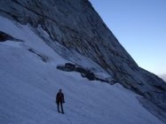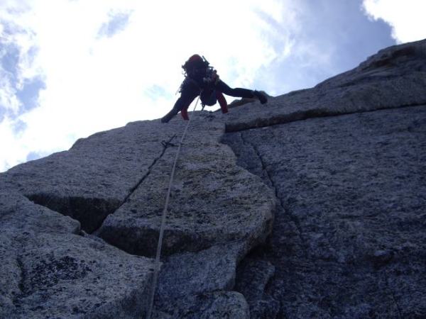 Zustieg zu Fußsteinkante über Gletscher bereits eine knifflige Angelegenheit. Haben die Randspalte ganz rechts überschritten und sind dann oberhalb dieser wieder gut 20 m nach links gegangen, um aufs Einstiegsband zu gelangen.