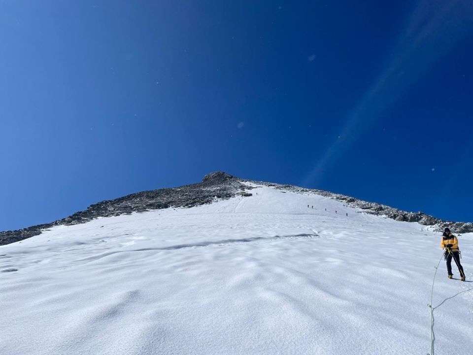 Bis zum Gletscherchen alles gut zu gehen, sehr gut mit Steinmännchen markiert. Gletscher gut eingeschneit, kein Schrund sichtbar. Top Trittschnee am Gipfelhang.