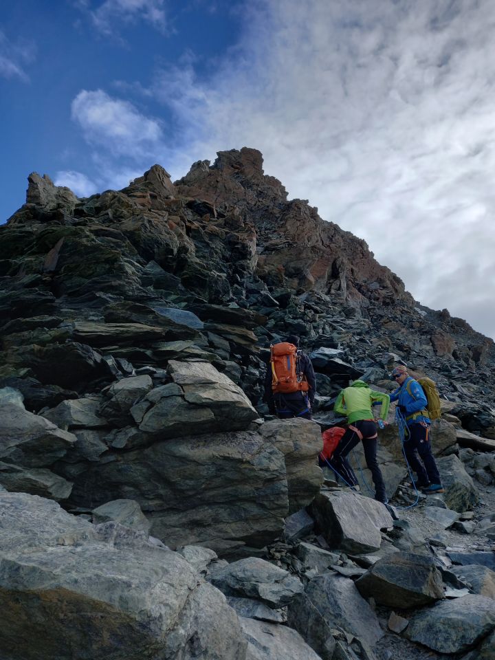 Start um 7:20 am Kleinmatterhorn. Recht kalt, da zugig. Spur gut gefroren, wir haben die Eisen erst nach Pkt. 3824 angezogen. Hurtig bis unterhalb SW-Rippe. Achtung auf Spalten, der Gletscher hat sehr wenig Auflage, auf der Autobahn bleiben. Fels aper und trocken, nirgends Eis, (Doppel-)Ketten in der Kletterstelle gut, das Couloir nach der Querung der Platte (subjektiv viel einfacher als befürchtet aufgrund anderer Berichte) hat wenig Tritte, der übliche Stau mit den usual suspects, Grat mit guter griffiger Spur, dementsprechend gut zu gehen, im oberen Teil eine ganz leicht eisige Stelle, welche etwas weniger griffig wirkt. Gute Rundsicht, trotz beginnendem Bewölkungsdeckel. Abstieg auf gleicher Route, yours truly mit Abseilen. Rückmarsch ganzer Weg ohne Steigeisen: Spur leicht aufgeweicht, aber nie mühsam, da kein Einsinken.