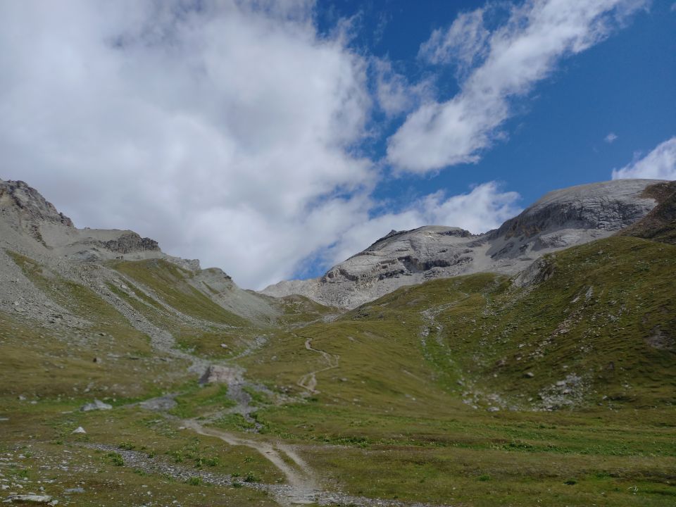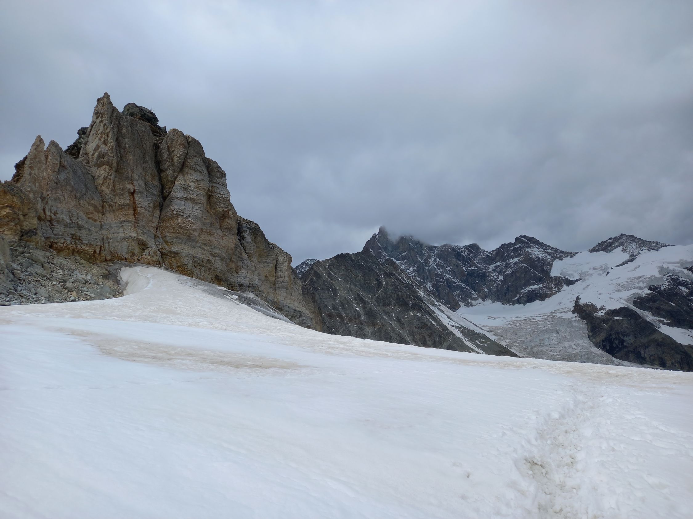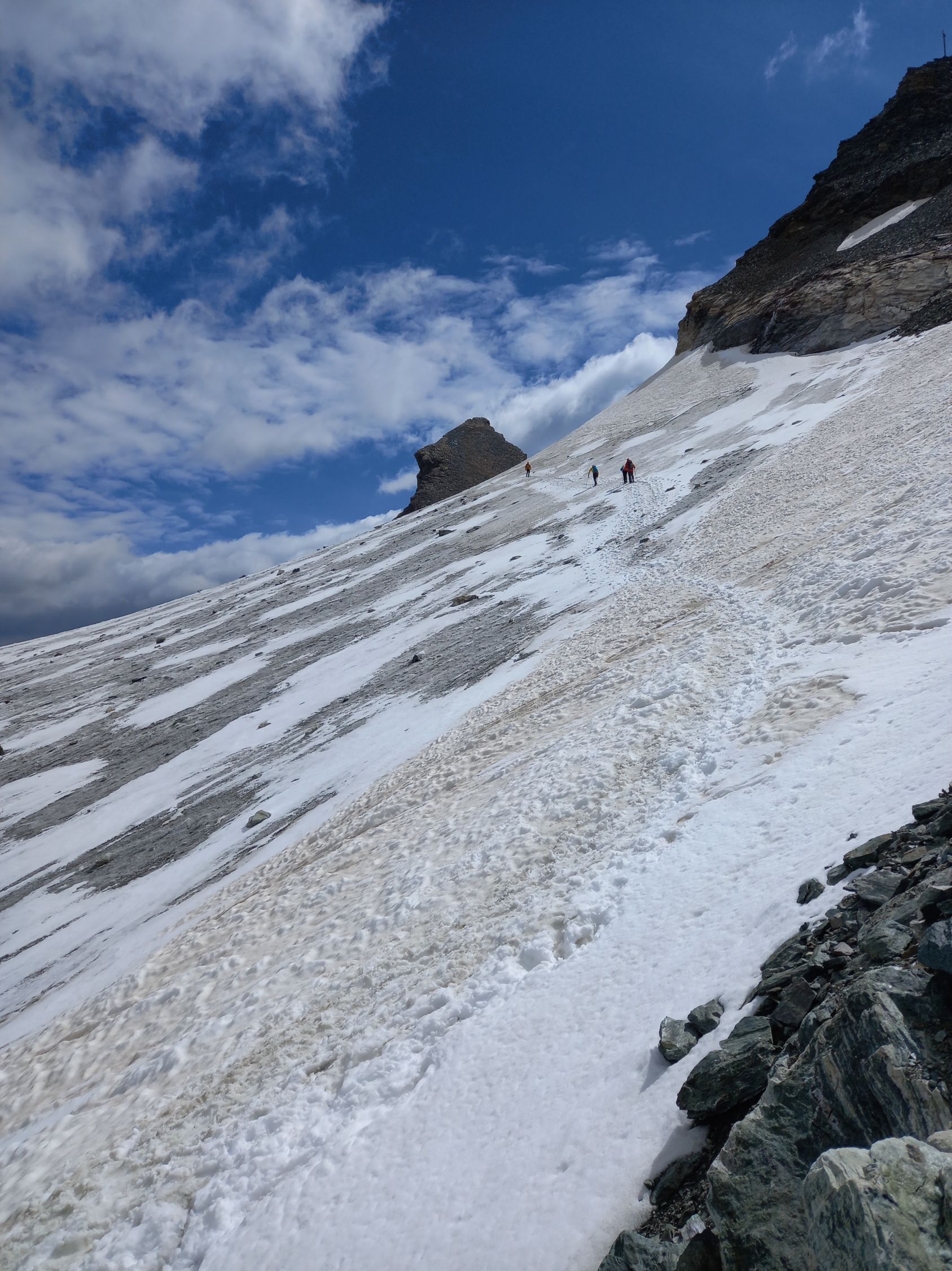 Start um 9 Uhr bei der Kirche in Zermatt. Hurtig hoch über Alterhaupt zum Berghotel Trift, dort dem Eistee-Sirenengesang von Hugo widerstanden ;-) und gleich weiter zur Hochebene der Triftchumme und zum Joch unterhalb des Platthorns. Sehr zugig. Für die Gletscherpassage waren die mitgebrachten Schneeketten sehr hilfreich: der