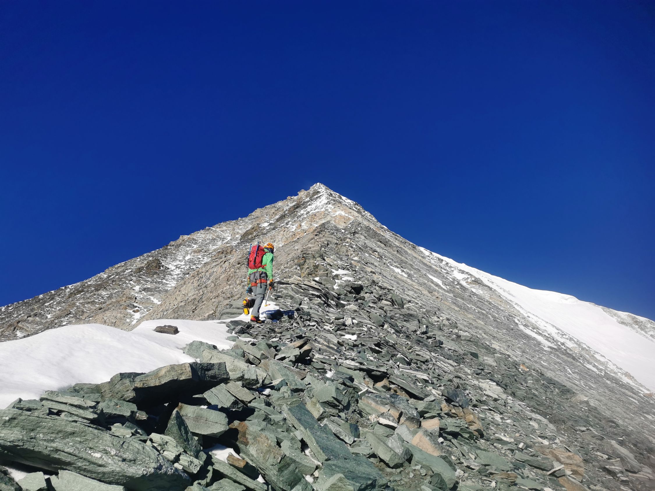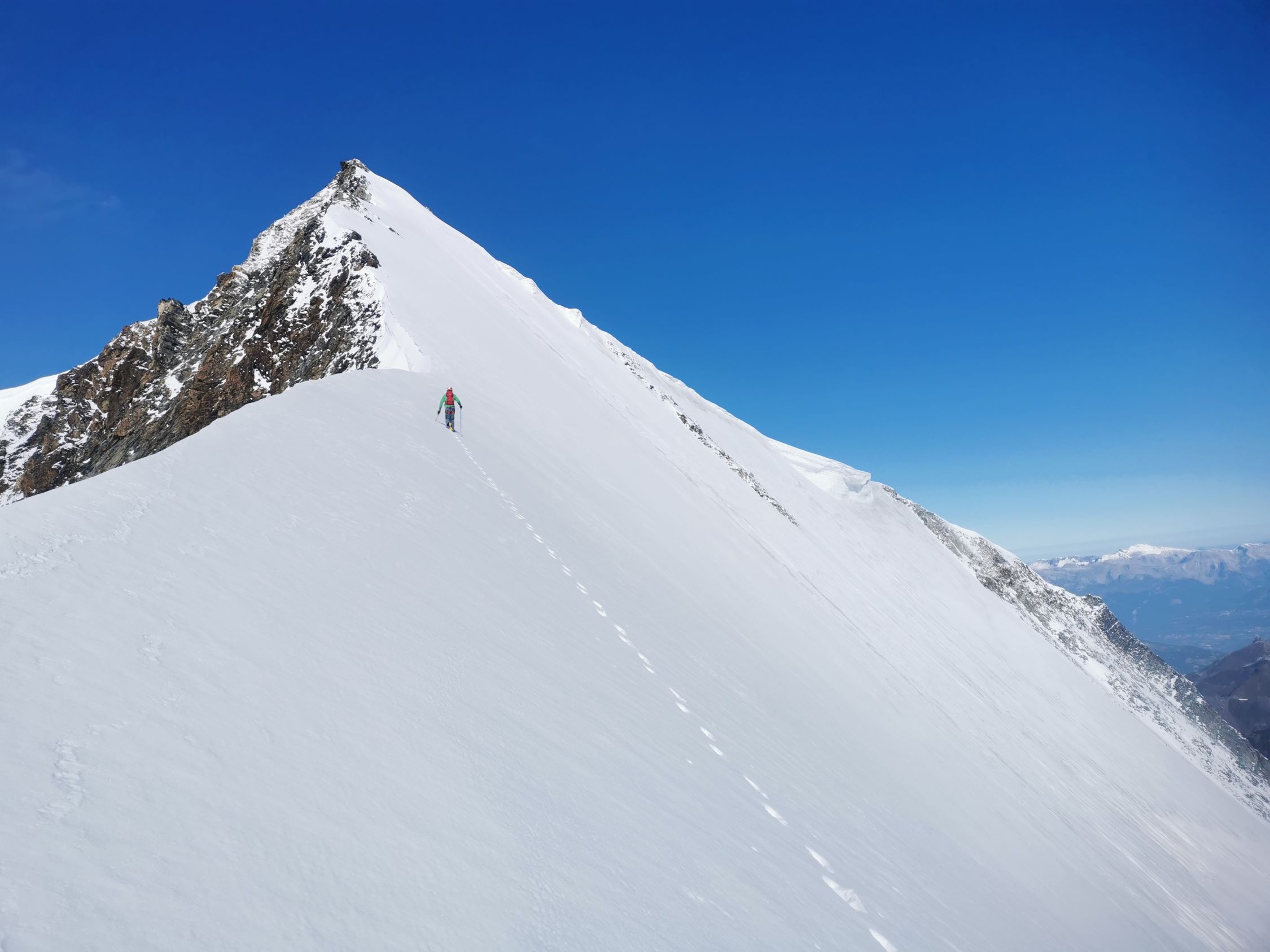 Gletscher bis zum Bisjoch aper. Der felsige Teil des Grates ist weitgehend schneefrei. Wir sind trotzdem komplett mit Steigeisen geklettert. Im oberen Teil bis zum Vorgipfel guter Trittfirn. Aufgrund der exponierten Lage ist hier trotzdem Konzentration erforderlich. Ein zusätzlicher Stock hilft hier ungemein. Abstieg über den Normalweg, dann aber zurück zum Vorder Sänntum über den unteren Turtmann-Gletscher. Hier müssen einige Spalten übersprungen werden.