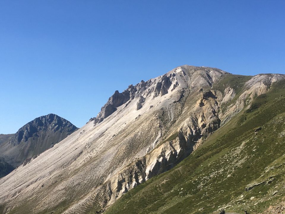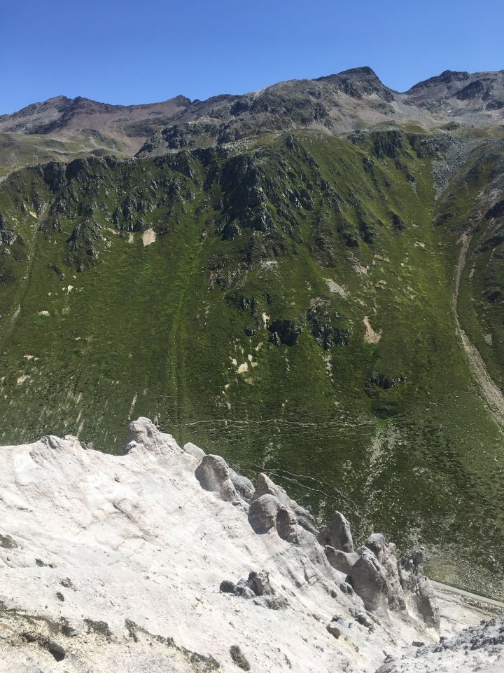 Einfache Wanderung zum imposanten Kalksteingebilde gegenüber Piz Ursera, T3+. Wir sind mangels Parkplatz hoch gefahren zur grossen Kurve unterhalb Moton P. 2326, hier haben knapp zwei Fahrzeuge platz. Nun einfache Wanderung teilweise auf Kuhpfaden zu Punkt 2339 und Punkt 2336, am Ende des Val di Gess hinunter und zwei kleine Bäche überqueren. Nun alles auf dem breiten Rücken, vor dem Gipfel steiler, zum Punkt 2414 Gess. Abstieg wie Aufstieg. Da wir nicht im Plan da li Tegi starten konnten gab es halt keine Rundwanderung um den Gess. Bei Start um 10 Uhr war es windstill bei 12 Grad, am Mittag sommerlich warm bei 20 Grad!