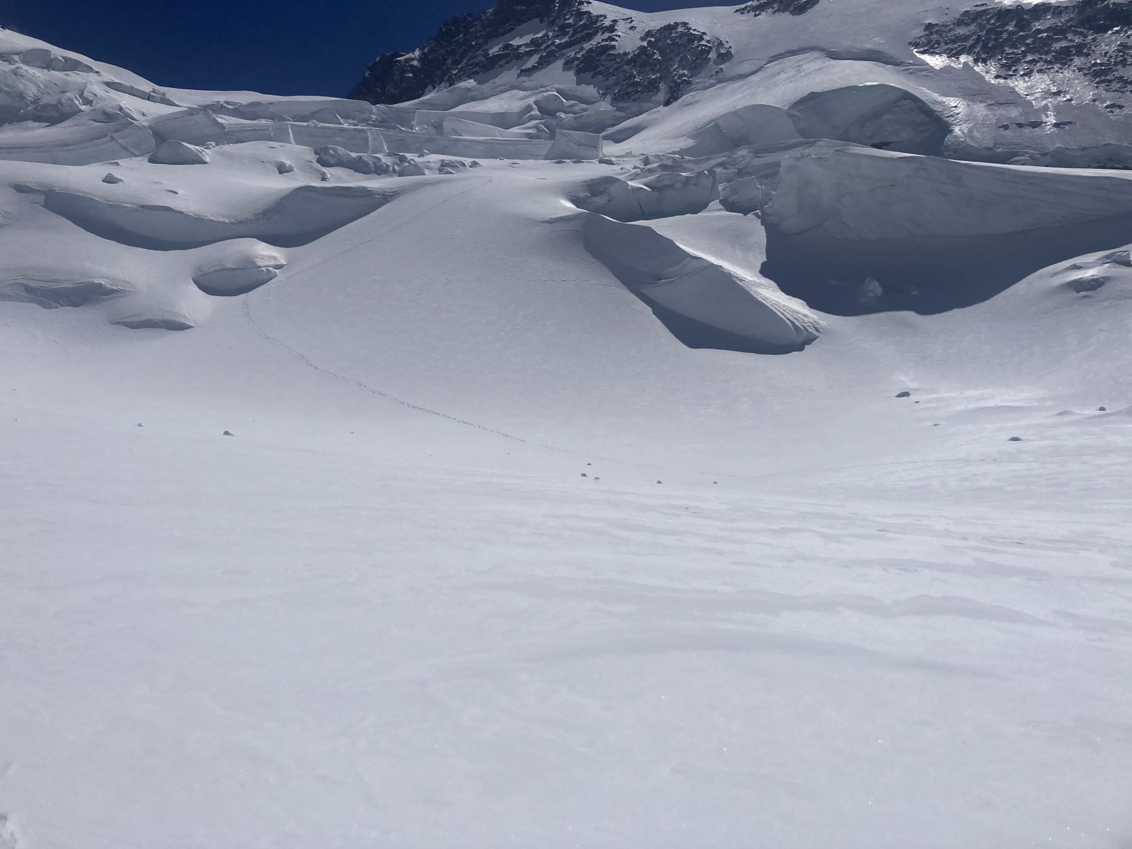 Abseilen in den Silbersattel möglich und gute Spur vorhanden durch die Spalten.