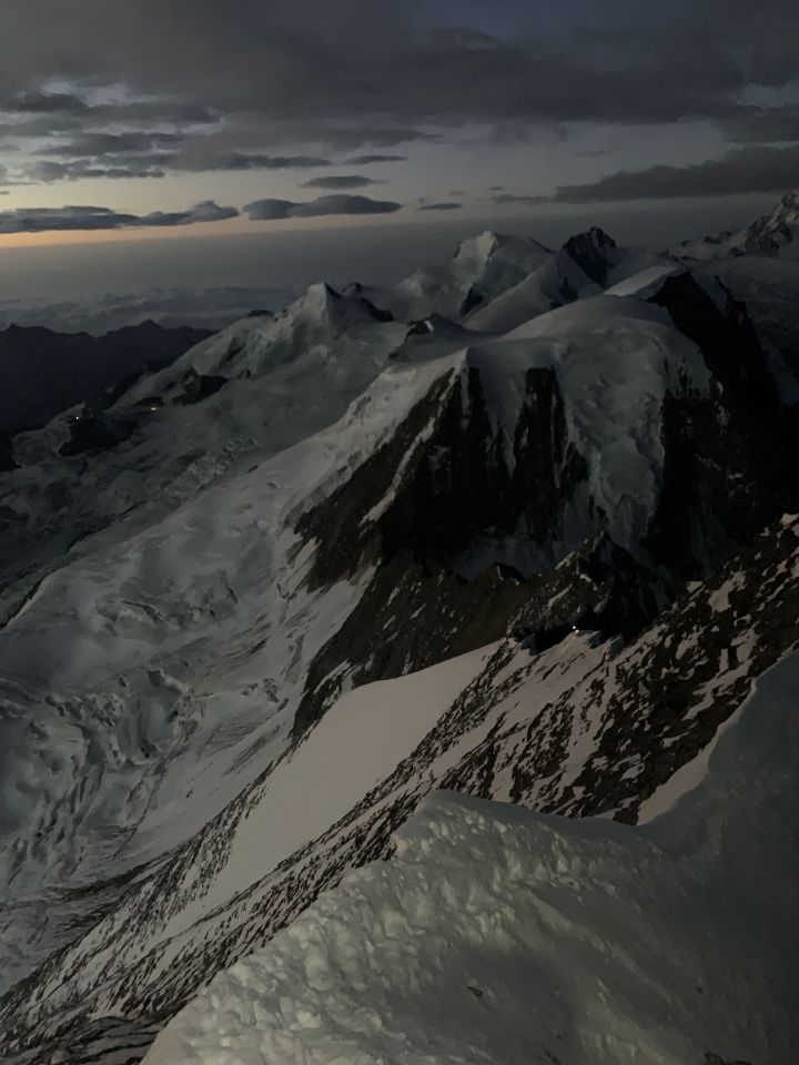 Start Mischabeljochbiwak 3:45 Uhr. Klare Nacht, kaum Wind. Fels trocken, bis zum ersten Firnaufschwung P4174 seilfrei ohne Steigeisen geklettert. Erster, steiler Firnaufschwung mit guter Trittspur. Restlicher Grat bis Täschhorn mit Steigeisen - geht einfacher, v.a. weil es immer wieder auch schmutzige/sandige Passagen hat. Abstieg Domjoch über Platten - auf Mattertaler Seite meist in guten, verfirnten Schnee mit Zwischensicherungen an Zacken. Aufstieg Dom ab Joch zunächst brüchig, insgesamt aber recht gut. Abstieg Dom um 9 Uhr auf Normalroute. Gute Spur, tragender Schnee. Im Abstieg auf den Festigletscher die letzten 50 Hm abgeseilt - 3 x 20 m an eingerichteten Ständen.