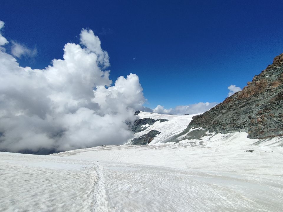 Start um 7.30, Retour an der Bahnstation 14.00 - Rückweg nicht mehr schön zum Laufen, viel Vorsicht geboten, Spalten mussten mehrfach grosszügig umlaufen werden. Wir werden unsere für Morgen geplante Tour auf den Pollux auf Grund der Spaltensituation nicht machen.
