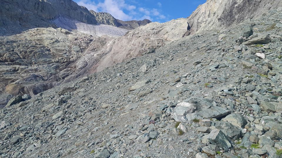 Um die o.g. heikle Stelle unter dem Gletscher zu vermeiden, haben wir beim Abstieg unter der Gletscherzunge auf die rechte Seite des Baches gequert und sind dort über Gletscherschliffen, zuerst weg vom Bach, dann wieder zu ihm abgestiegen (hier teilweise wie im SAC Tourenportal angezeigt). Anders als in Tourenportal angezeigt, haben wir dann auf etwa 2700 m wieder auf die linke Seite des Baches gewechselt und dort den Pfad gefunden. Diese Variante war bei trockenem Fels angenehm; bei Nasse oder Vereisung wäre es anders.