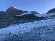 Zustieg zum Mischabeljochbiwak. Start um 5:00 Uhr auf der Täschalp/Ottawe 2205 m, 8°C, klare Nacht. Gegen 3300 m im Bereich Gletscherzunge Randfelsen z.T. mit Reif von den schwachen Niederschlägen des Vortags überzogen. Alphubelgletscher südlicher Arm aper, kurze, eisige Stelle im Bereich des Felsriegels gegen 3600 m. Unproblematisch. Wenige, gut erkennbare kleinere Spalten im weiteren Aufstieg zum Alphubeljoch 3772 m. Via P 3903 dem Gratverlauf (SE-Grat) zur Eisnase gefolgt – Firn/aperer Fels. Eisnase mit guter Spur im Hartschnee, kein Blankeis. Traverse Alphubel 4206 m bis P4124 auf guter Spur im Hartschnee, keine Spalten erkennbar. Abstieg Nordgrat ins Mischabeljoch 3855 m seilfrei, ohne Steigeisen in aperen Fels (Stellen 2-3, z.T. griffarm/plattig).