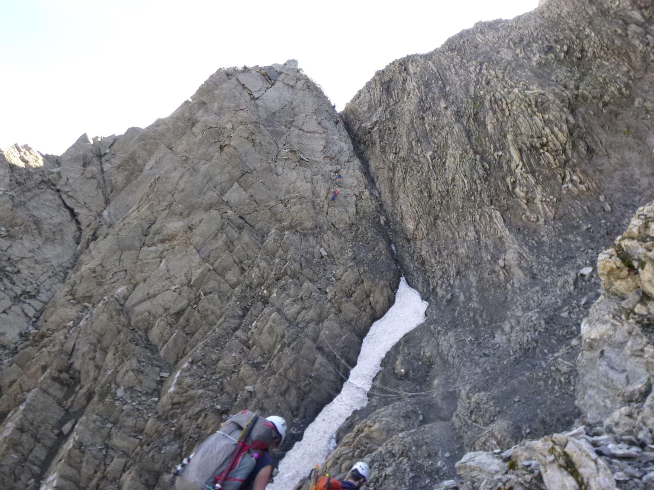 Ich entschied mich, den AHW von Ost nach West zu steigen. Zum einen, weil ich die Sonne lieber im Rücken habe. Zum anderen, weil die Schlüsselstelle (Eisrinne) näher zur Augsburger Hütte liegt, falls man feststellt, dass diese unpassierbar ist ohne Risiko. Darüber hinaus gibt es im August bekanntlich eher Mittagsdunst und nachmittags Quellwolken, so dass man den höchsten Punkt des AHW besser am Vormittag überschreitet und ggfs. noch Rundumsicht genießen kann.