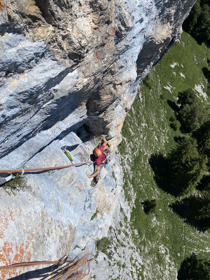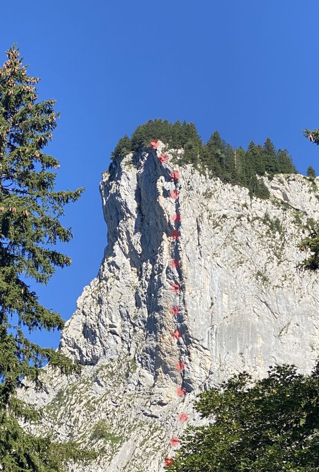Kühl und Regen am Tag vorher. Sonnig für uns, trockener Fels und nicht zu warm. Sicherungszustand OK - alte, aber ordentliche Bohrhaken von Sanierung 1990, und alte Schlaghaken noch mit F.A. (Franz Anderruthi) eingraviert. Wenig Begehungsspuren. Insgesamt eher eine Tour für Frühjahr/Herbst. dann auch weniger Bewuchs.