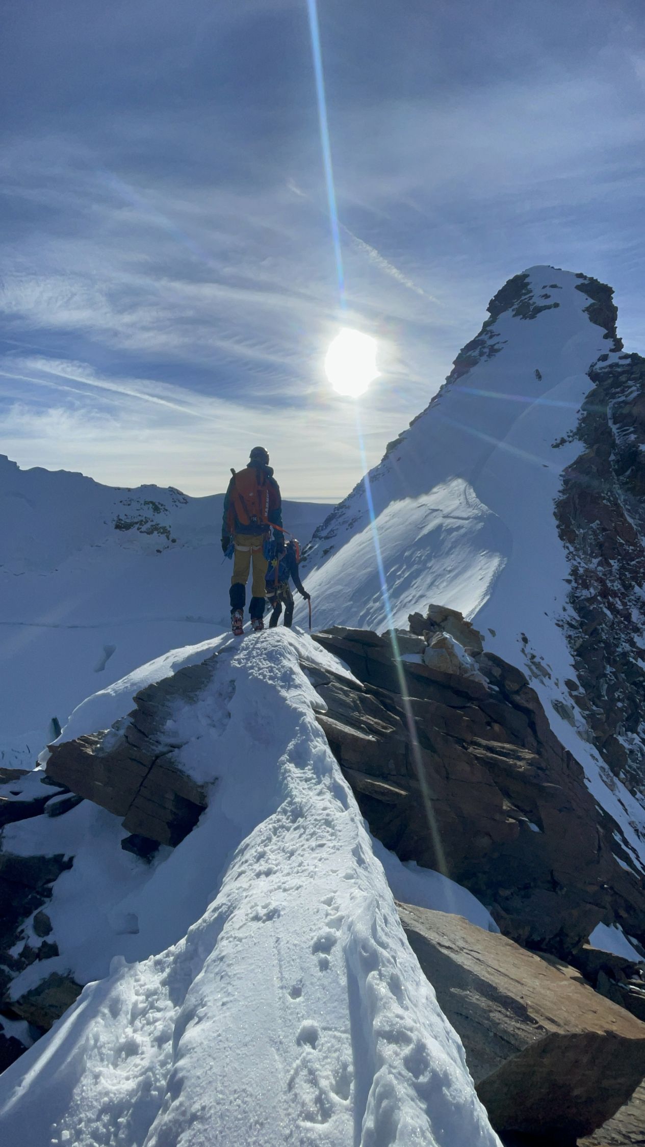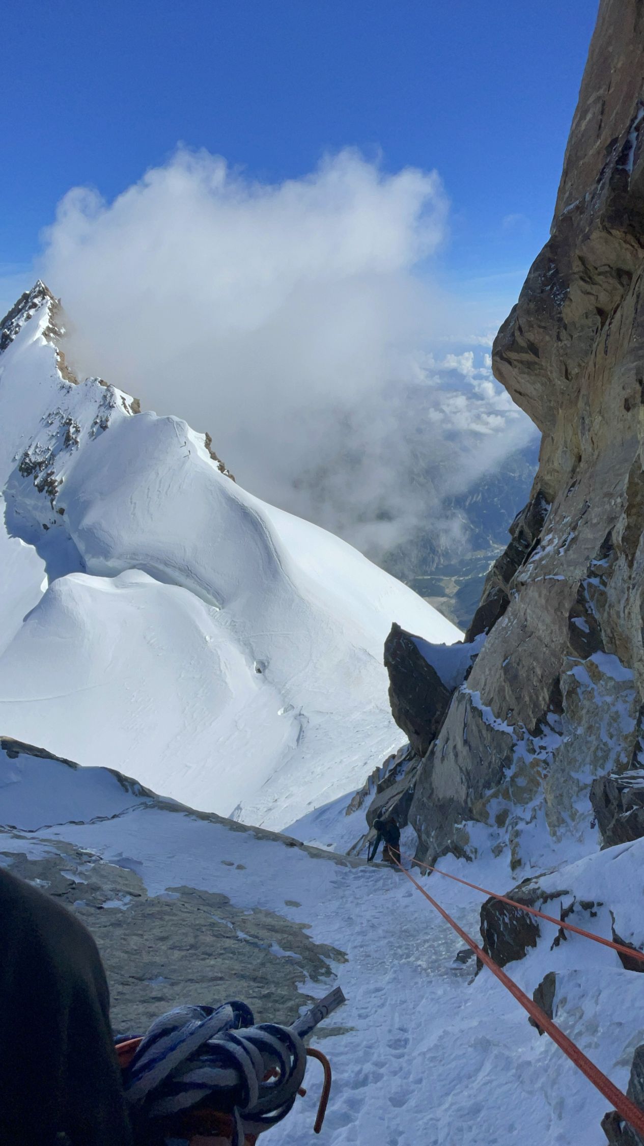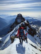 Perfekte Verhältnisse angetroffen. Spalten sichtbar oder offen und zu umgehen. Flanke perfekter Trittfirn und gut gehbare Firngräte zwischen den Kletterstellen am Grat. Alles seilfrei und mit Steigeisen begangen. Abseilen über Silbersattel dann etwas zeitraubend bei 4 Personen in unserer Seilschaft. Nordend mussten wir aufgrund hereinziehenden schlechten Wettern dann leider auslassen und sind direkt abgestiegen. Abstieg dann wieder zügig. Nur ein kleiner Spaltenbruch im Abstieg bis Hüfte und etwas Spaltenlabyrinth im letzten Abschnitt.