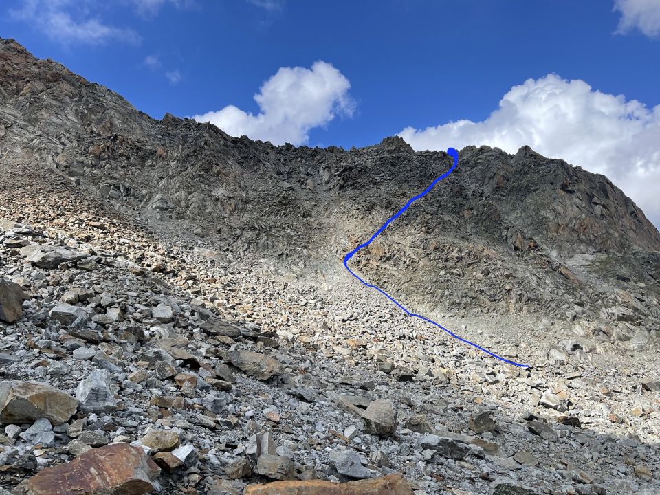 - Einsteigsflanke: diese haben wir gut erwischt, in dem man zunächst auf den grossen Schutt-Blöcken schräg in Richtung Südwand hochgegangen sind. Ab einem sekundären Schutt-Kegel ca. auf Kote 3060 m scharf nach rechts über eine schräge schuttbedeckte Rampe direkt auf den Grat (siehe Foto).