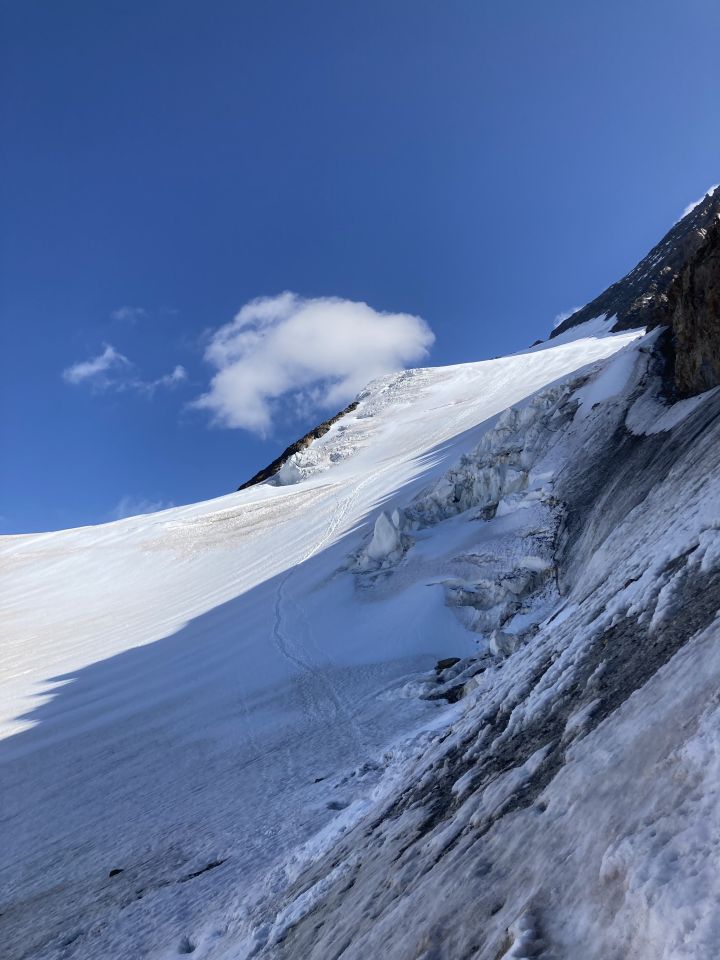 Erster Gletscher über der Hütte blank, zweiter Gletscher nach rippe durchgehend schnee, gut machbar