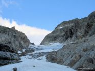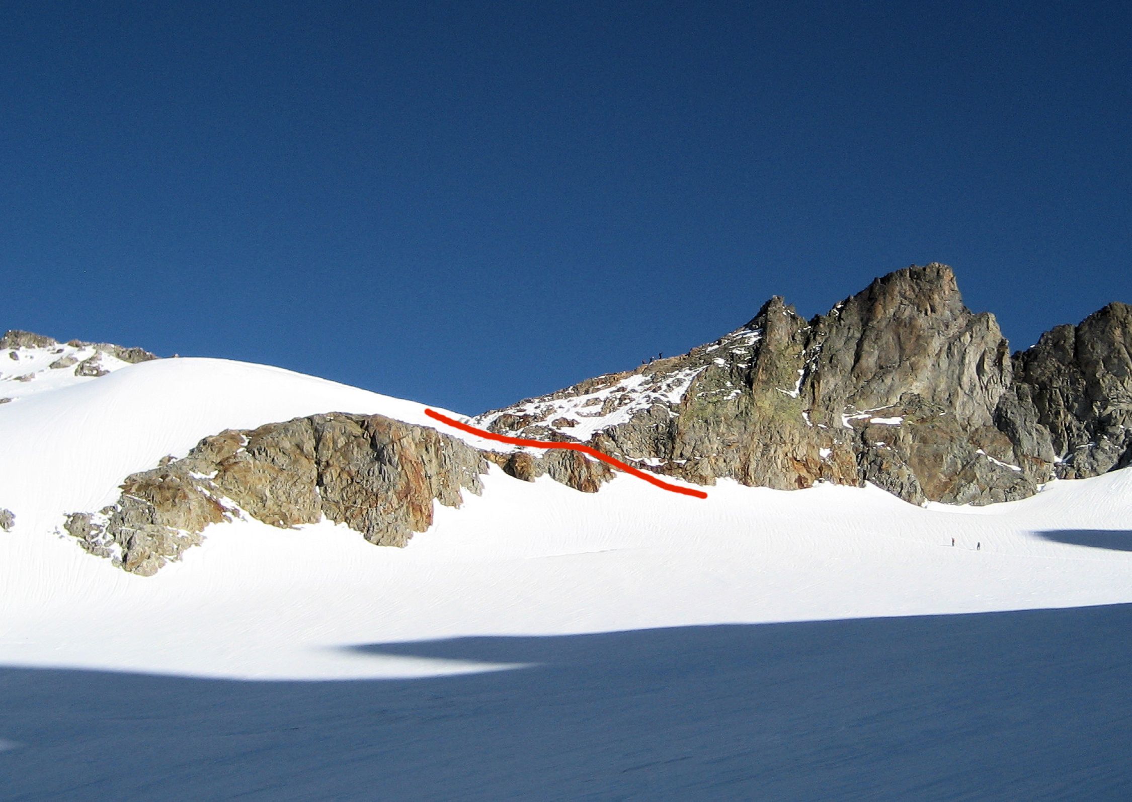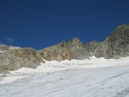 Im September 2007 habe ich den Normalaufstieg auf den Grassen auch schon mal gemacht. Der Übergang auf den Stössensattel hatte damals geschätzte 30 m! mehr Eis auf dem Stössenfirm. Siehe persönliches Bild. Die beiden Tourengänger steigen quer nach links auf und gelangen zwischen den rötlichen Felsen auf den Sattel. Heute muss man fast 50 m abseilen oder über das Fixseil abklettern.