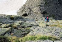 Abstieg: Der lange Abstieg über den Grassengrat hat noch einige kleine Schneefelder drin. Weich und problemlos. Der Abstieg vom Stössenjoch ist mit einem Fixseil ausgerüstet. Das verlangt recht viel Kraft, nicht ganz einfach. Sicherung mit Karabiner und Schlinge dringend empfohlen. Auf dem Firn haben wir wieder die Steigeisen angezogen. Der weitere Abstieg über z.T. glatt geschliffene Felsen braucht seine Zeit. Später dann auf dem blau-weiss markierten Weg zur Sustlihütte zurück.
