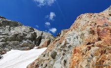 Der Aufstieg über den Gletscher zum Grassenjoch geht problemlos. Ab Beginn des Eises haben wir die Steigeisen angezogen. Das Eis ist griffig. Es hat nur wenige problemlose Spalten. Die Kletterei in der Südwand ist toll. Es braucht jedoch etwas Angewöhnung mit den harten Bergschuhen zu klettern. Der Fels war warm und trocken.