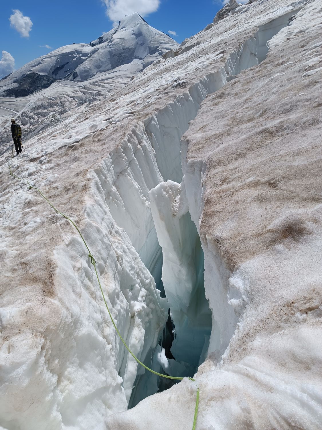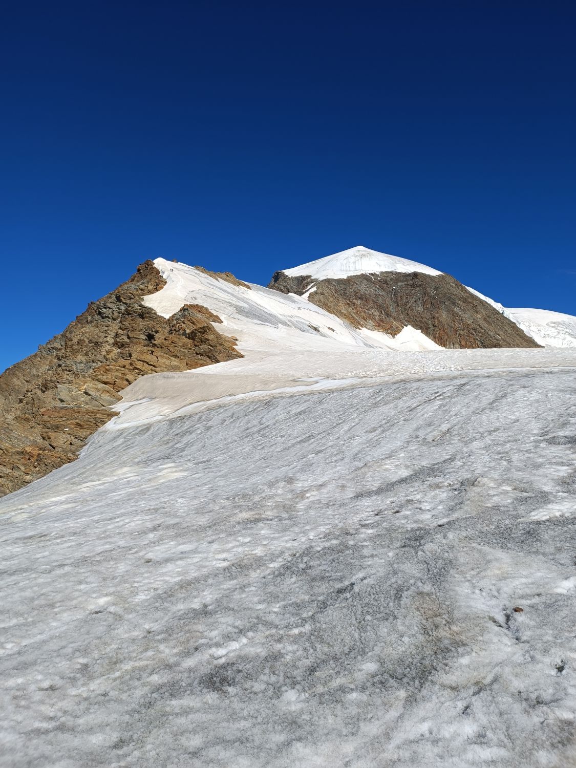 Aufstieg Mittelallalin bis Feejoch noch gut. Fels am Feechopf trocken und gut zu gehen, Kletterei genussvoll, nicht zu weit in die Flanke dann wird's bröselig. Aufstieg Eisnase noch gut. Abstieg nach Längfluh ging besser als erwartet. Ein paar Spalten sind zu überspringen...unten Gletscher blank