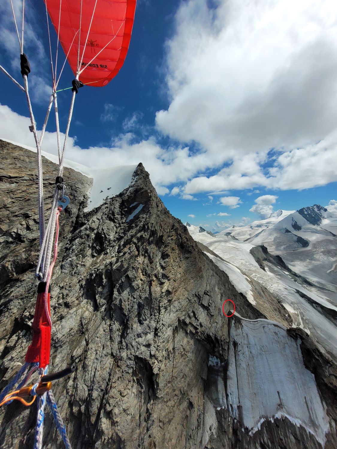 Dank an meinen Sohn für die Führung! Runter mit Gleitschirm ab Nordgipfel nach Täsch. Der Fussabstieg über die Eisnase sah zu meiner Überraschung immer noch gut aus (siehe auch Eintrag vom 20.8.)