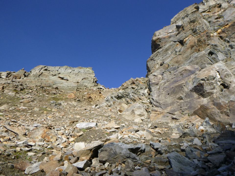 Im Abstieg machte ich den Fehler und versuchte der Winterroute zu folgen (ähnlich Route 801.9 laut SAC-Alpinführer) über den NO-Kamm, also bei Erreichen der NO-Rippe nach links auf nördlichen Sabbione-Gletscher zu gelangen. Die Winterroute führt jedoch mehr oder weniger über dessen Bereich mit Spalten, die im Winter meist geschlossen sind. Obendrein waren die oberen Gletscher-Enden aper und schlammig. Insofern folgte ich der NO-Rippe weglos bis kurz vor markantem Felsturm Rocce della Croce, wo es nicht mehr weiterging. Dort kletterte, besser ausgedrückt: halbrutschte ich kurzes Schlammstück im linken Couloir hinab zum oberen 40° steilen Ende vom Hohsandgletscher und umkurvte anschließend zeitaufwändiger die Spalten im oberen Bereich des Gletschers. Das ist im Sommer nicht empfehlenswert. Besser man überwindet sich viel weiter oben zuvor und steigt den rechten Gletscherteil (Ghiacciaio Lebendun) nur anfangs steil hinab, umrundet dann den Felsturm nordseitig und gelangt danach zum spaltenarmen Teil des nördlichen Sabbione-Gletschers, welchen man dann wieder etwas, jedoch unsteil hochlaufen muss bis zum Hohsandjoch. Dauert zwar etwas länger, ist aber bequemer und jedenfalls im Sommer sicherer.