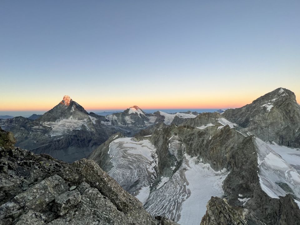 Zustieg vom Arbenbiwak bis zur Einstiegsrinne ohne Steigeisen machbar (rechts vom Schnee halten). Gesamter Grat trocken und ausgezeichnet. Vom Gipfel Richtung Wellenkuppe runter 7x abgeseilt. Der Firngrat apert aus (Blank, ggf heikel). Nachts zwar gute abstrahlung aber tagsüber am Gletscher sumpfig. Gute Spur rüber zur Rothornhütte.