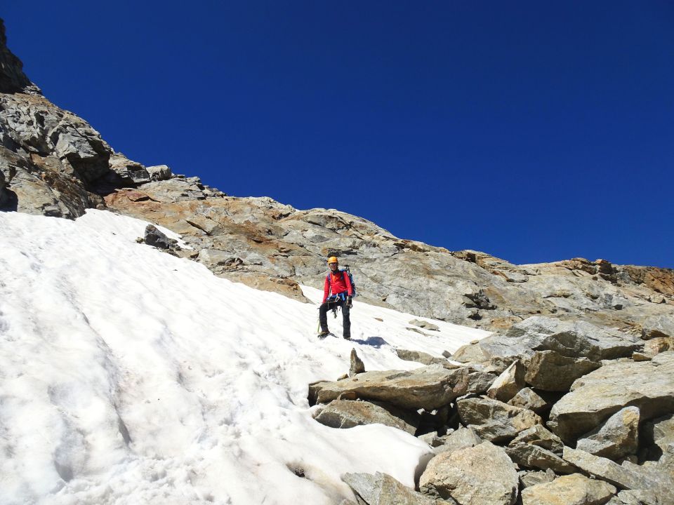 Die Bewertung "machbar" bezieht sich auf die Gletscherquerung zum Normalweg im oberen Bereich. Gletscher hier aper, steiles Blankeis und zudem sehr steinschlägig. Wir sind am Rand mit zwei Eisschrauben auf ein Schneeband unterhalb abgestiegen und auf diesem zum Normalaufstieg gelangt. Alternative ist das Überklettern der brüchigen Türme oberhalb direkt zum Gipfel, wovon grds. aber eher abgeraten wird.