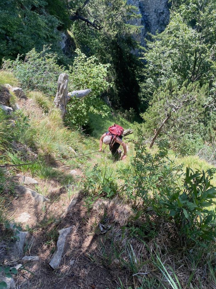 Durch die vielen Draht- und Fixseile (die im Text des SAC-Führers Zentralschweizer Voralpen und ergo auch bei den Archivrouten des Tourenportals nicht vorkommen), ist die Route nicht ganz so kriminell. Anstrengend bleibt sie aber, nach dem Einlaufen ins Schilteli geht es praktisch nur obsi, und das nicht allzu flach... Trittsicherheit und Schwindelfreiheit sind immer noch Voraussetzung, aber man geht keine unverantwortlichen Risiken ein, wenn man die Route mit Bedacht begeht. Für Geübte keinerlei Sicherungsmaterial nötig, hingegen leistet ein kleiner Pickel im steilen Gras gute Dienste.