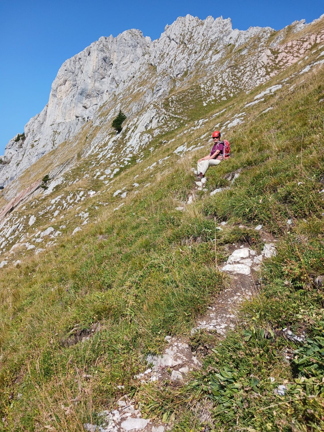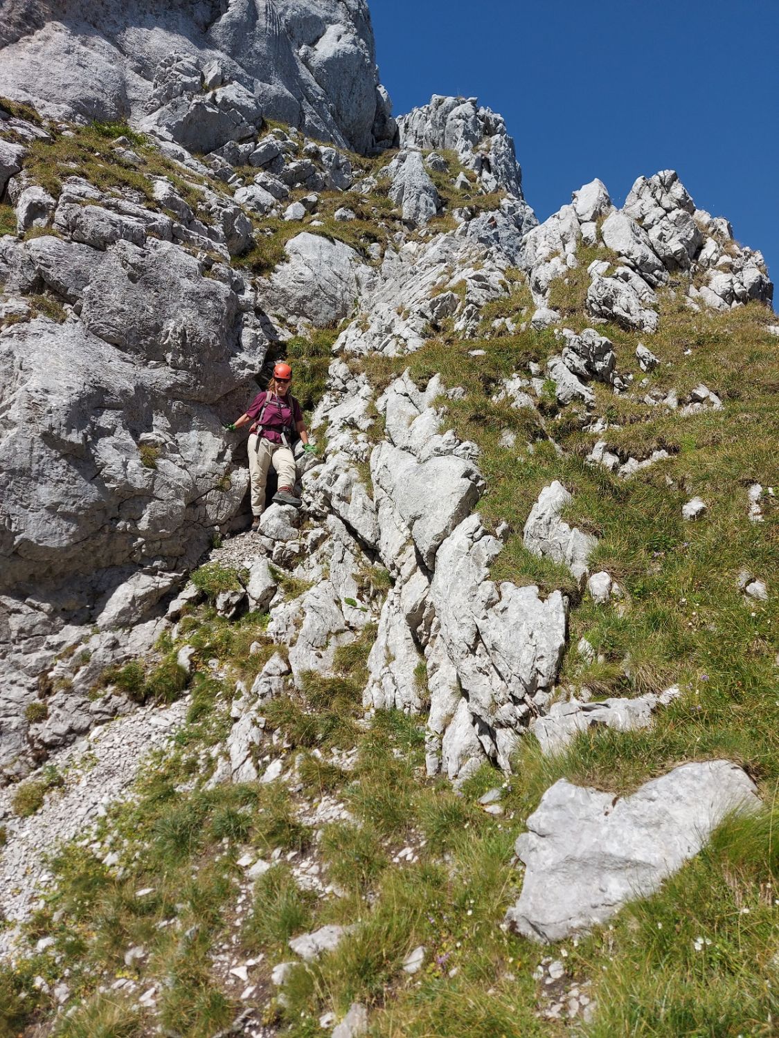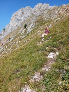 Die vorliegende Beschreibung mit den verschiedenen Farben im Gipfelbereich: Nichts derartiges gesehen. Im Couloir hoch, ganz links an der Wand bleiben, auch wenn es kein Seil mehr hat. Oben nach links über Grastritte und weiter oben über Felsstufen zum Gipfel. Bewertung durch H. Kley: T5 oder T5- wegen Einstieg unten und einer abdrängenden Stelle in der Südflanke: Diese Stelle ist ohne Seilbenutzung nur durch Kriechen machbar.