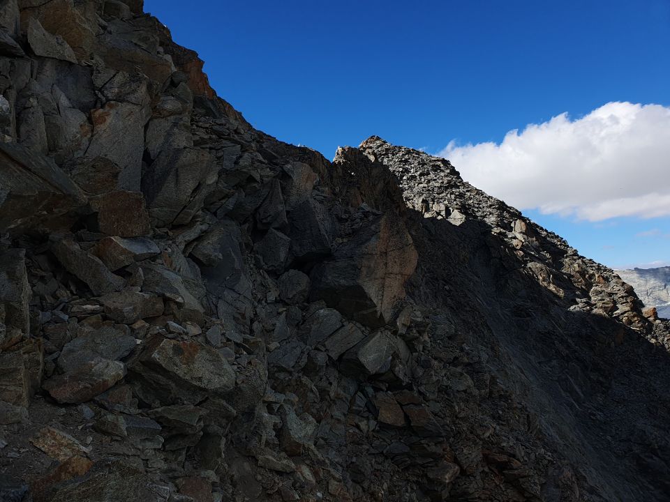 Bis zur Abzweigung P2862 ("Besso" steht in roter Schrift auf einem Stein geschrieben) kurz vor der Cabane du Mountet ist der Wanderweg gut ausgebaut. Danach sind Pfadspuren mit roten Punkten und Steinmänner im Geröll erkennbar. Der Einstieg beim Couloir liegt bei ca. P3245 und wird links hochgeklettert. Ab und an sind weiterhin rote Punkte und/oder Steinmänner erkennbar. Es gibt zwei Routen für den Aufstieg ab dem Couloir. Ich bin über den Südwestgrat hoch (T6-, II) und über der mittleren Rampe hinabgestiegen (T5+, II), wobei ich beim Abstieg eine zu spät genommene steilere Rinne mit genommen habe (kurze Stelle T6, II+). Der Südwestgrat (nur mit Steinmänner markiert) ist meiner Meinung nach etwas ausgesetzter (Turmwechsel, überquerung eines Bandes in einer Scharte) und die Wegfindung etwas mühsamer und dadurch leicht schwieriger als die mittlere Rinne (vereinzelt rote Punkte). Ab dem Südostgrat in ca. 15 Min. mit ein einer weiteren kurzen Kletterstelle auf dem Gipfel.