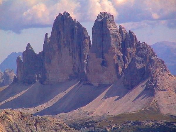 Die Drei Zinnen. Die bestechende Eleganz dieser drei Felspfeiler, die aus dem Nichts fast endlos in den blauen Himmel ragen, hat sie weltberühmt gemacht. Sie sind Sinnbild und Markenzeichen für die Dolomiten. Millionenfach abgelichtet gingen atemberaubende Bilder um die Welt. Immer wieder machten die Drei Zinnen auch durch alpine Glanzleistungen auf sich aufmerksam. 1933 gelang Emilio Comici die erste Durchsteigung der Nordwand der Grossen Zinne. Erst vor 2 Jahren (2002) ging eine weitere alpine Glanzleistung um den Erdball. Alexander Huber stieg ohne Benutzung von Hilfsmitteln (weder zur Fortbewegung noch zur Sicherung) die Direkte "free solo" durch die Nordwand der Grossen Zinne. Es ist also nur verständlich, wenn viele Bergsteiger davon träumen, einmal auf dem Gipfel dieses grossartigen Berges zu stehen. Die einfachste Tour führt heute durch die Südwand (II und III), die beliebteste über die Dibonakante (III und IV, Varianten auch V). Wir nehmen die Route durch die Südwand, die landschaftlich besonders schön und eindrucksvoll ist. Bis zum Ringband klettert man auf durchwegs festem, gutgriffigem, teils aber abgespecktem Fels. Zum Gipfel hin gibt es etwas mehr Schotter, daher Steinschlag durch vorausgehende Partien. Das Finden der richtigen Route war für uns nicht wirklich ein Problem. Die vor Jahren angebrachten Markierungen wurden wieder entfernt. Nach der ersten Scharte gibt es aber etliche Steinmännchen, die eine gute Orientierungshilfe sind. Im Abstieg gibt es mehrere Abseilmöglichkeiten. Wir haben insgesamt 7 bis 8 mal mit 50 m Seil abgeseilt. Einmal hat's nicht ganz gereicht und wir mussten noch einige Meter abklettern. Insgesamt eine Traumtour, für alle die sich in diesem Schwierigkeitsgrad wohl fühlen. Mein Kumpel Harry hat das mit den Turnschuhen erledigt.