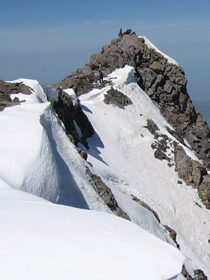 Ab Alplager Ala-Archa via Ak-Say-Tal steil hinauf zum Fialjetovy-Pass, dann dem Grat folgend zum Gipfel. Wenig Schnee für diese Jahreszeit. Auch Kirgisen mit Turnschuhen erreichten den Gipfel...