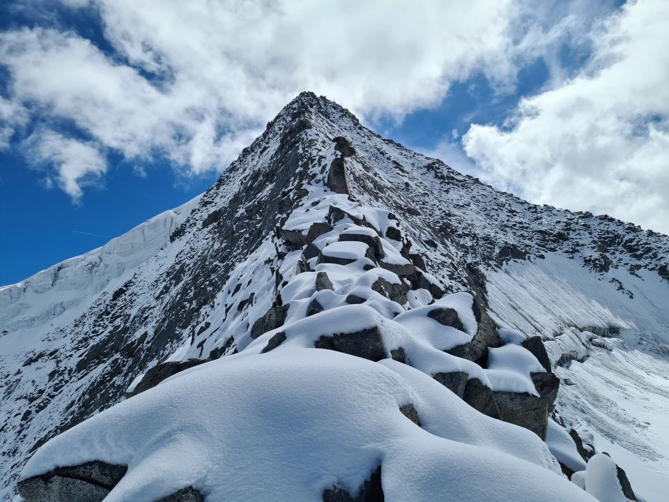 Gletscherzustieg ohne Probleme, Einstieg über Meynowscharte selber gespurt, im Grat liegt Schnee, Begehung komplett mit Steigeisen. Sicherungspunkte tlw schwer zu finden, erste SL der Schlüsselstelle nicht gefunden, da Haken unterm Schnee, zweite SL dann okay, nicht vereist.