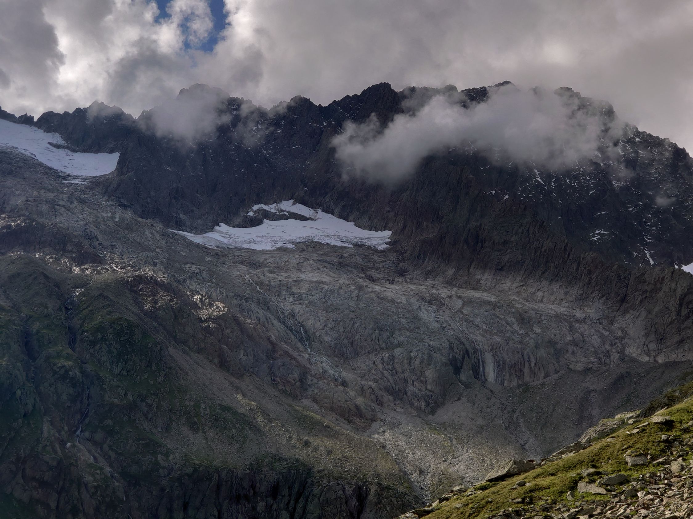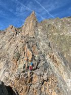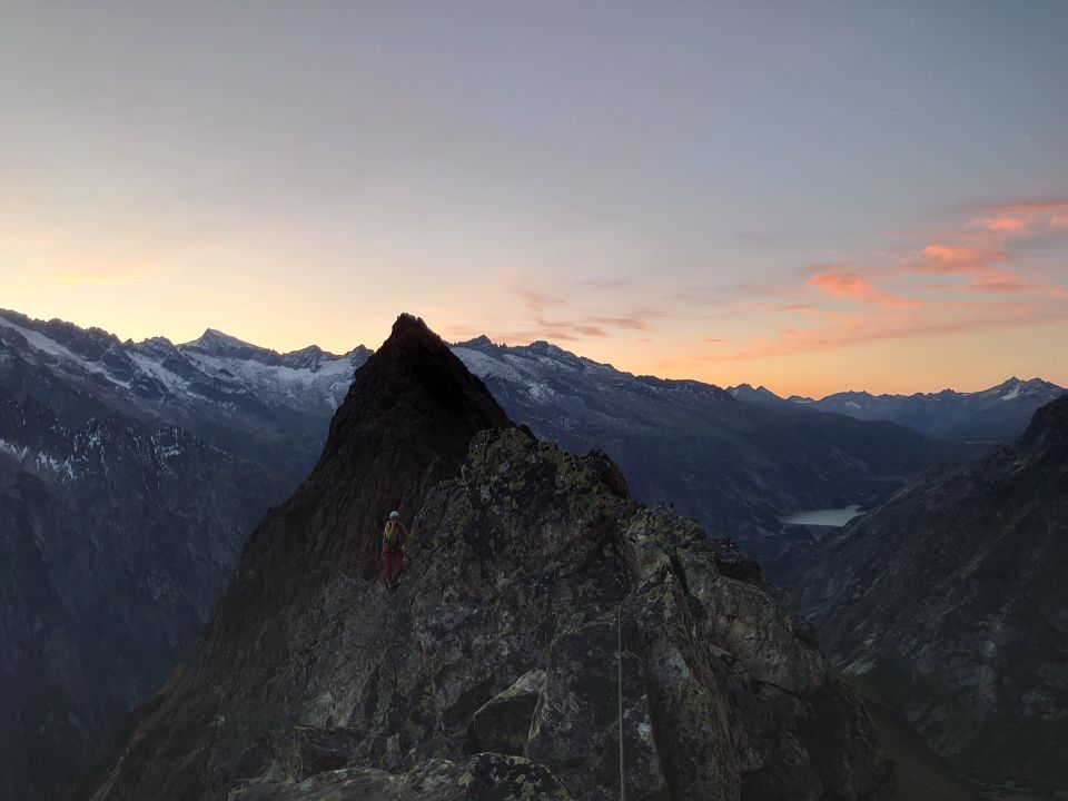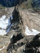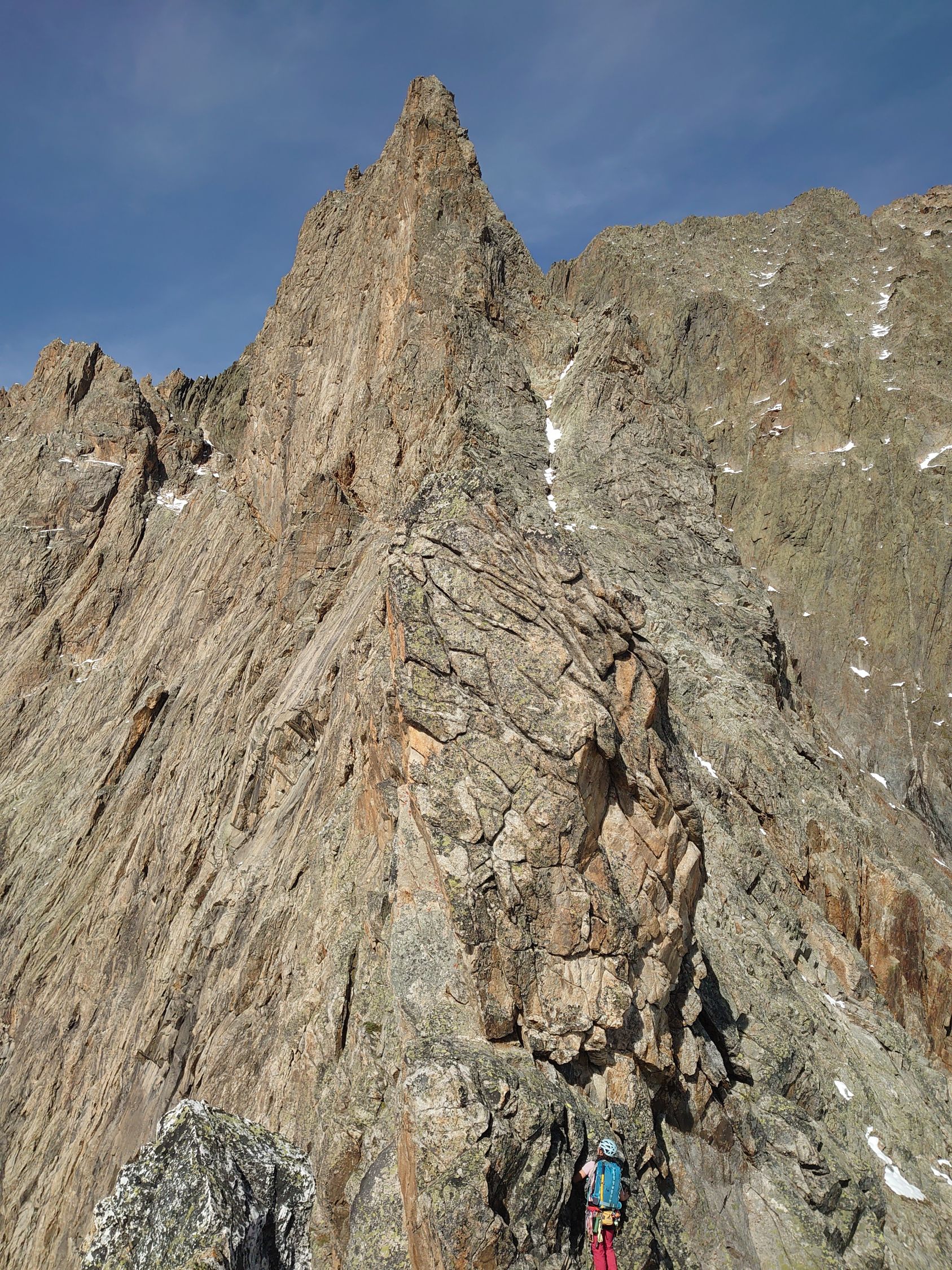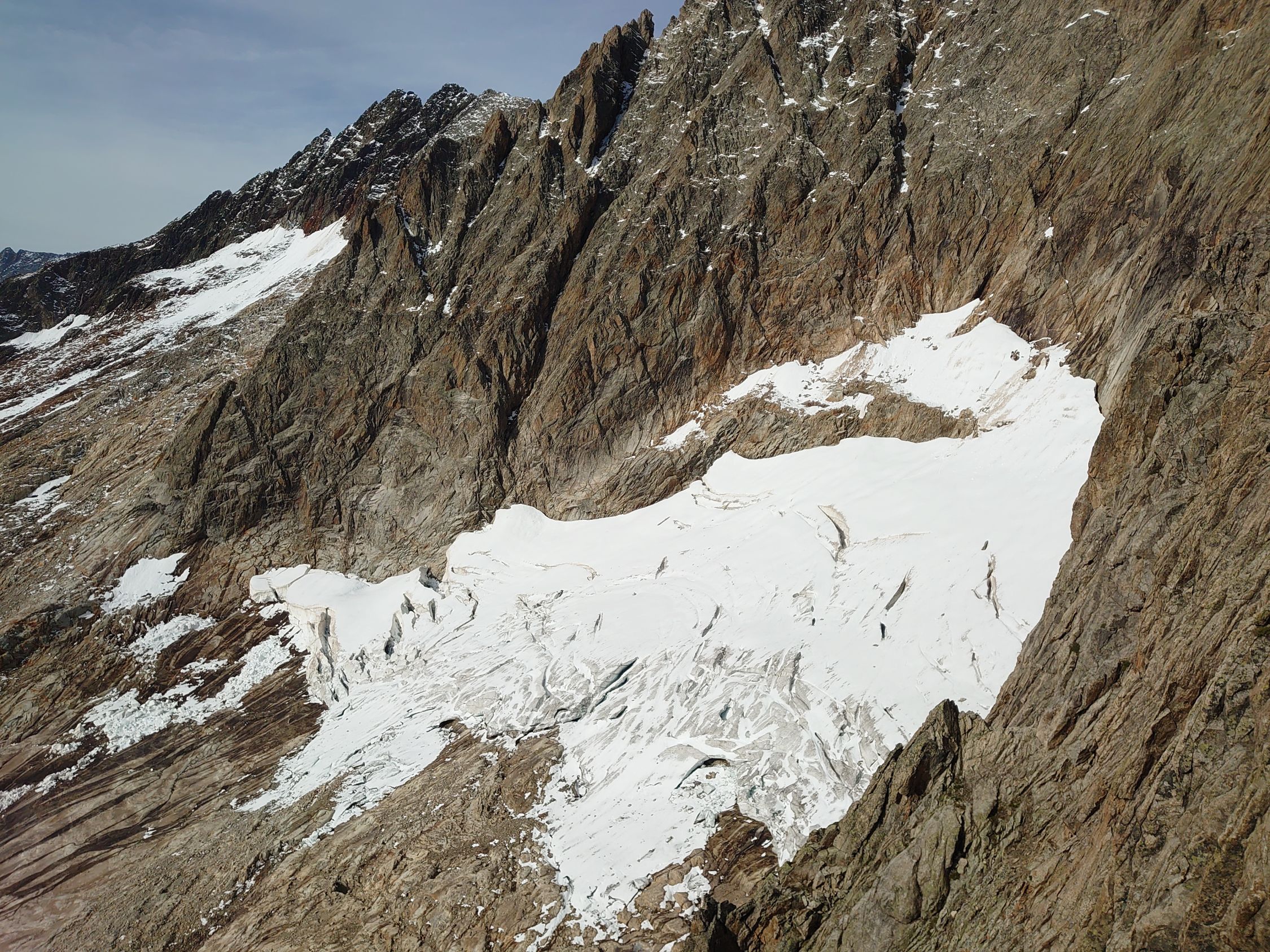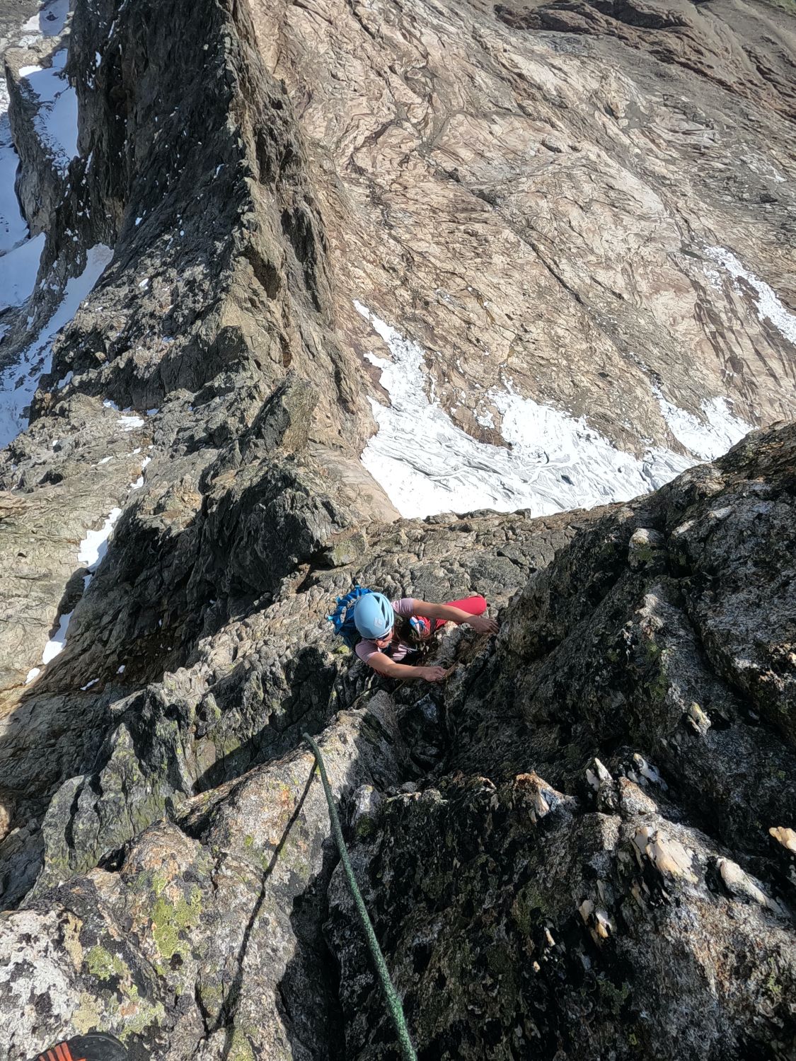 Der Grat ist grösstenteils trocken und schneefrei. Einige kleinere Stellen mit Schnee von der Niederschlagsperiode Ende KW 34 stören kaum. Im Abstieg vor allem im Trichter unterhalb P. 3893 etwas mehr Schnee. Randkluft aktuell noch gut passierbar. Wird aber vermutlich schon ab nächster Woche problematisch sein. Auf dem Ärlengletscher nur noch wenige Resten Neuschnee.