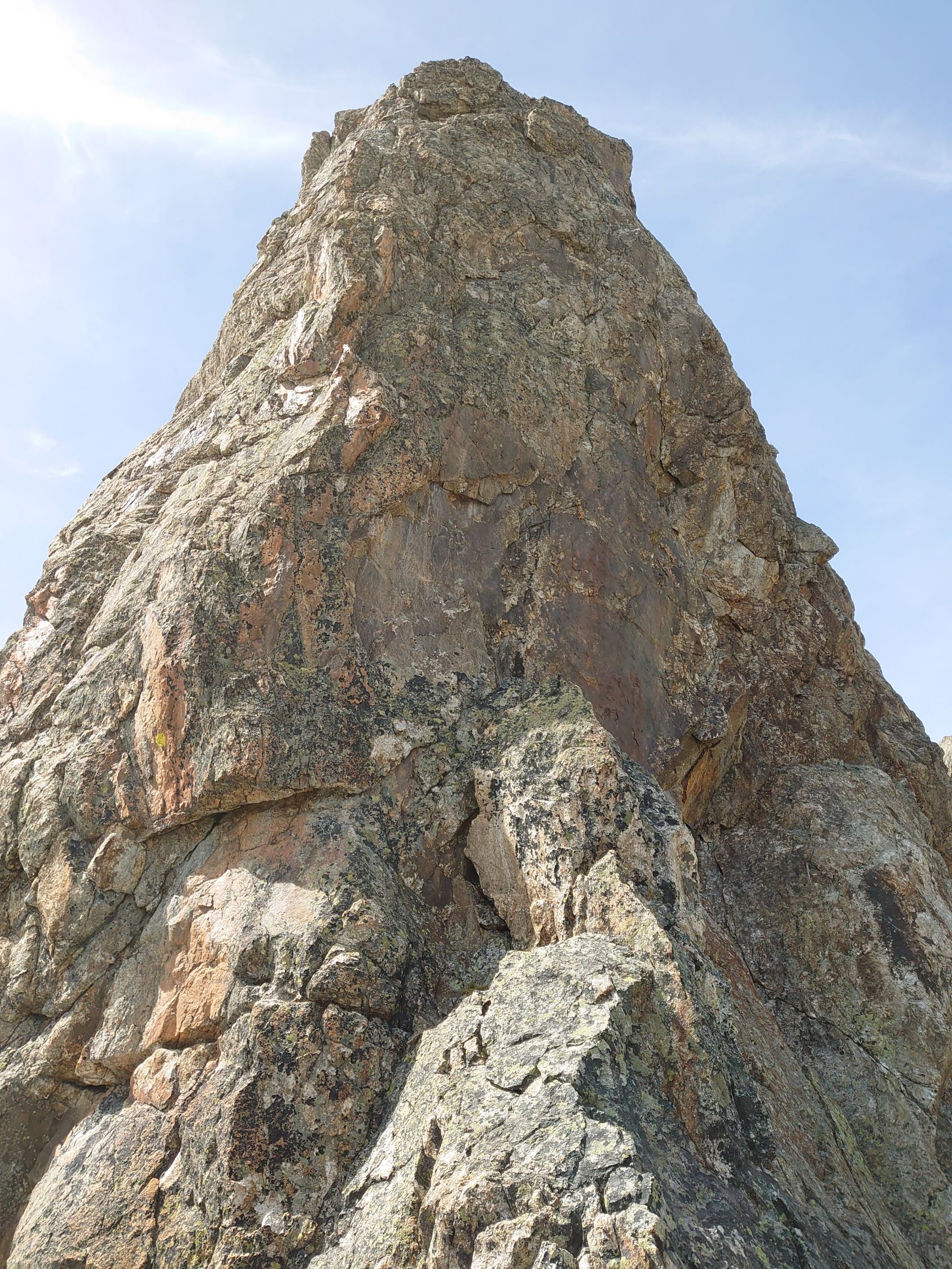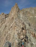 Sehr markant steilt die Wand vor dem grossen Turm auf. Hier gibt es mindestens zwei Möglichkeiten. Die leichtere Variante folgt dem Couloir zur Rechten (NH mit roter Reepschnur zu Beginn). Schöner klettert man die steile Wand zur Linken auf ein kleines Podest mit dem Routenbuch. Danach nach rechts traversieren (1 NH) und der Kante entlang (2NH) auf ein weiteres Podest (gute Standmöglichkeit). Weiter etwas leichter, aber immer noch fordernd und steil der Kante folgen. Vermutlich könnte man auch vom Routenbuch weg die linke Kante klettern. Sieht aber einiges schwieriger aus und wurde von uns nicht nachvollzogen.