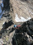 Und nochmals 50 m auf ein sehr kleines Podest. Dort lehnte noch eine dünne Schneebrücke über die Randkluft. Gut möglich, dass diese schon in wenigen Tagen nicht mehr hält.