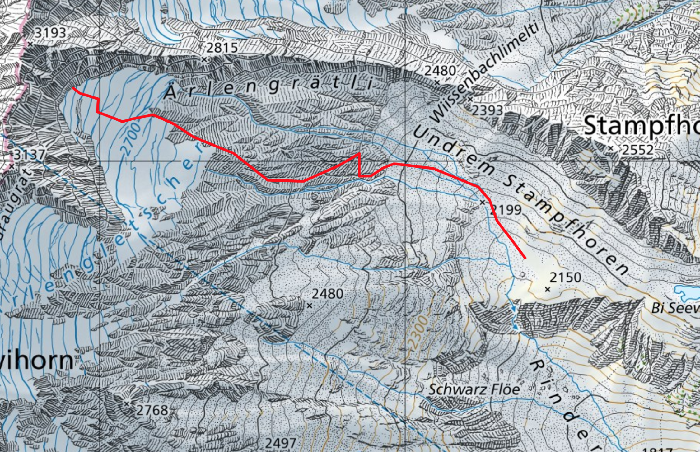 Den Abstieg über den Ärlengletscher überlegt man sich am besten, wenn man den Gletscher noch aus der Helikopterperspektive sieht. Und den Weiterweg über die Gletscherschliffplatten kann man gut schon am Vorabend vom Seelein aus erspiegeln. Die Variante im SAC Tourenportal sieht möglich aus, haben wir aber nicht nachvollzogen. Wenn die Rinne an der Grenze von Granit zu kristallinem Schiefer noch mit Schnee gefüllt ist, wäre dies wohl die beste Abstiegsmöglichkeit. Bei Ausaperung sicher mühsam. Wir stiegen von rechts nach links über die Platten, bis ein breites, leicht schuttiges Band wieder nach rechts in die Nähe des Baches führt. Zuletzt noch wenige Meter leicht durch einen Schlitz abklettern.