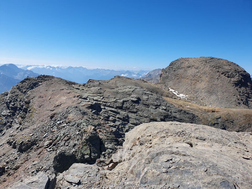 Bis zum Lägh da Cam auf Wanderweg, danach weglos und/oder auf leichten Pfadspuren mit Steinmänner hoch zum Ostgipfel. Ab da leichter Übergang (eindrückliche Steinplatten mit Rissen) mit einem kleinen leichten Aufstieg zum Hauptgipfel. Der Westgrat ist für den Abstieg etwas leichter als der Ostgrat und wegen dem Schutt auch etwas angenehmer. Hier gibt es bis zum Pass einen kleinen schuttigen Couloir hinabzusteigen und später einen Weg durch die Wand im Schutt bewältigen (beides jedoch einfach zu meistern).