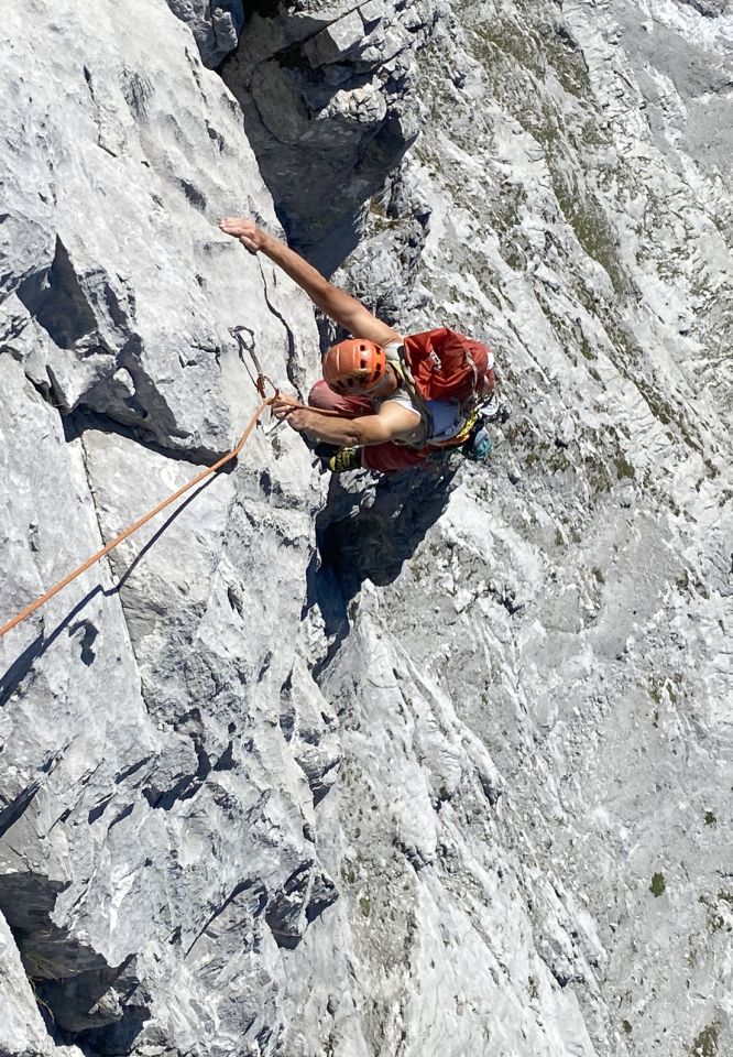 Wer ganz gerade hochsteigen will kann dies auch tun. Wir haben nach SL2 die direkte Fortsetzung in der Felsprinzessin genommen. Dazu steigt man vom Stand die Wasserrille hoch (sehr guter Riß für mittleren Cam in 3 m Höhe) und dann 1 m weiter zum 1. Bh. Dann leicht nach R hoch und schräg über die Platte nach L (relativ griffig zu einer Felskante (Bh), dann R haltend zu SU und gerade hoch (58 m, 6a+), Danach eine schöne 50 m Länge zu Muniring. Gerade hoch zum Überhang, L über diesen hinweg (Bh) (6b oder 6a,Ao), weiter hoch (Bh) und leicht L haltend über Wasserrillenplatten zu Stand. Von diesem Stand wenige Meter nach R oben auf das große Band auf das alle Routen führen. Leicht R haltend kommt man auf die Mangold (Stand unter SL7). Mit 60 m Seil reicht das ganz knapp, eventuell muß der Zweite etwas nachsteigen (einfaches Gelände). Alternativ kann man am Oberende des Bandes (Zwischen)Stand an einem Cam machen.