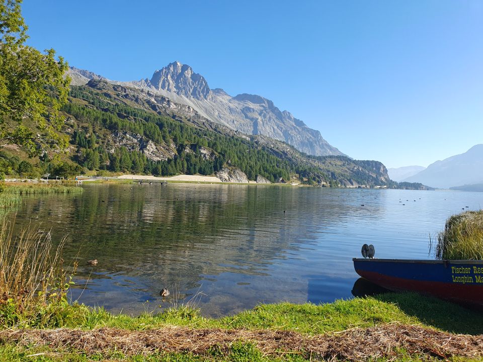 Hinab bin ich dem Südsüdostgrat hinab via P3037 und P2968 (einzelne Steinmänner vorhanden) bis zur normalen Route bei ca. P2640 (T5+, II). Der Südsüdostgrat wird beim Abstieg ziemlich schnell anspruchsvoll, so, dass man ihn meist kurz unterhalb des Grats in östlicher Richtung hinabsteigt. Es lohnt sich P3037 kurz zu besuchen (schöne Aussicht, auch auf dem Südsüdostgrat). Ab P2968 viel Geröll hinab zur normalen Route. Danach bin ich nach Sils Maria weitergegangen und mir im Silsersee ein Bad gegönnt. Der Silsersee war frisch (12°C), aber hat Körper und Geist wieder belebt!